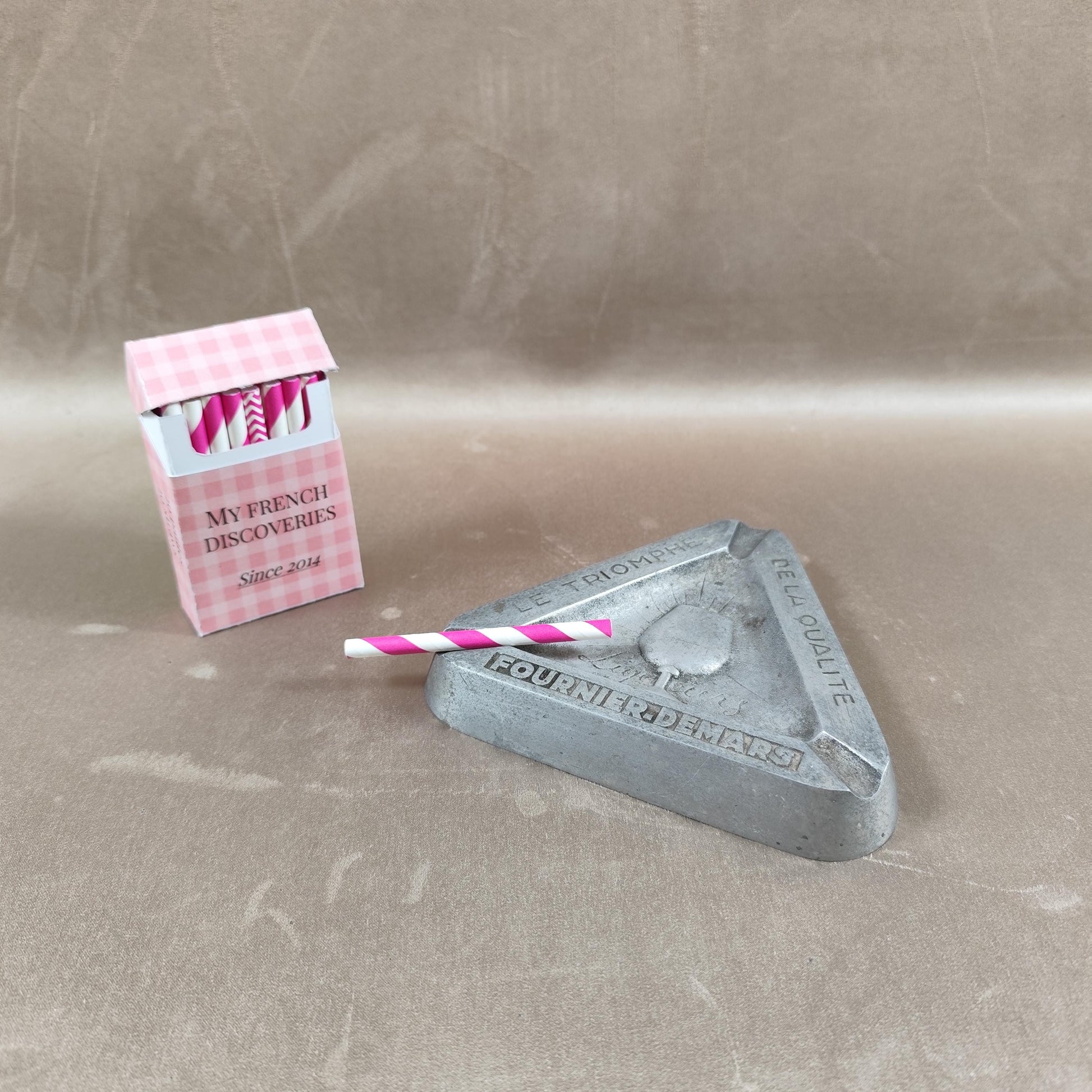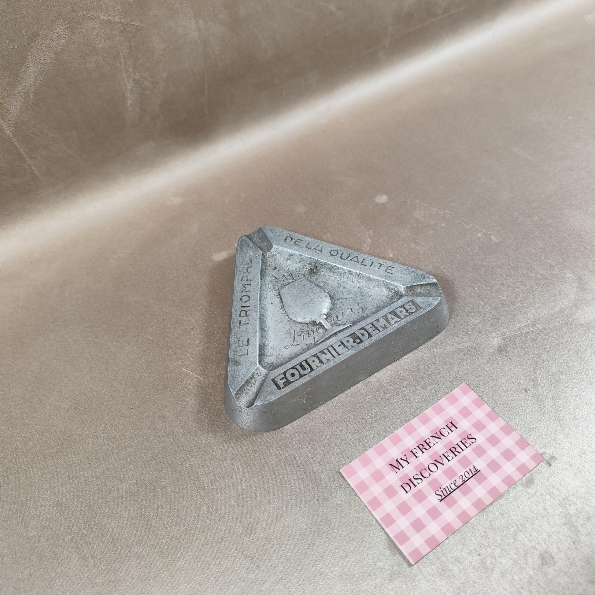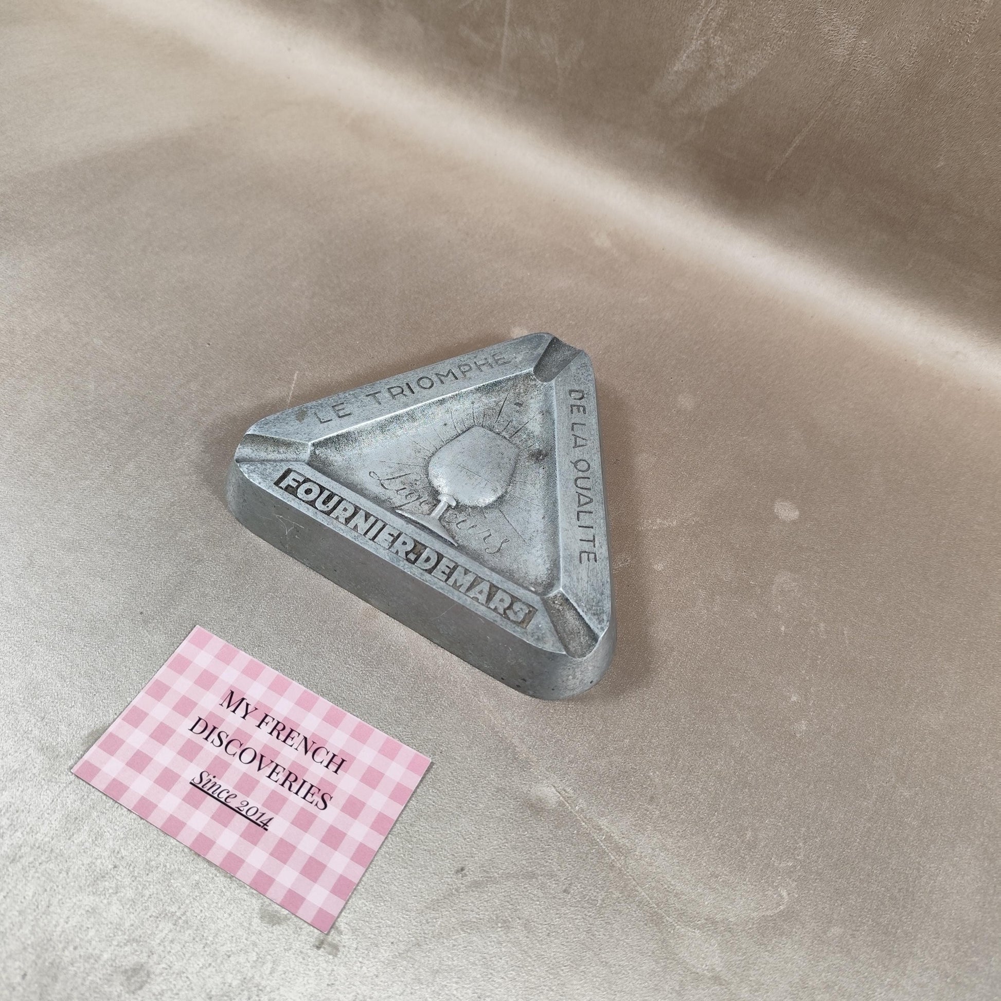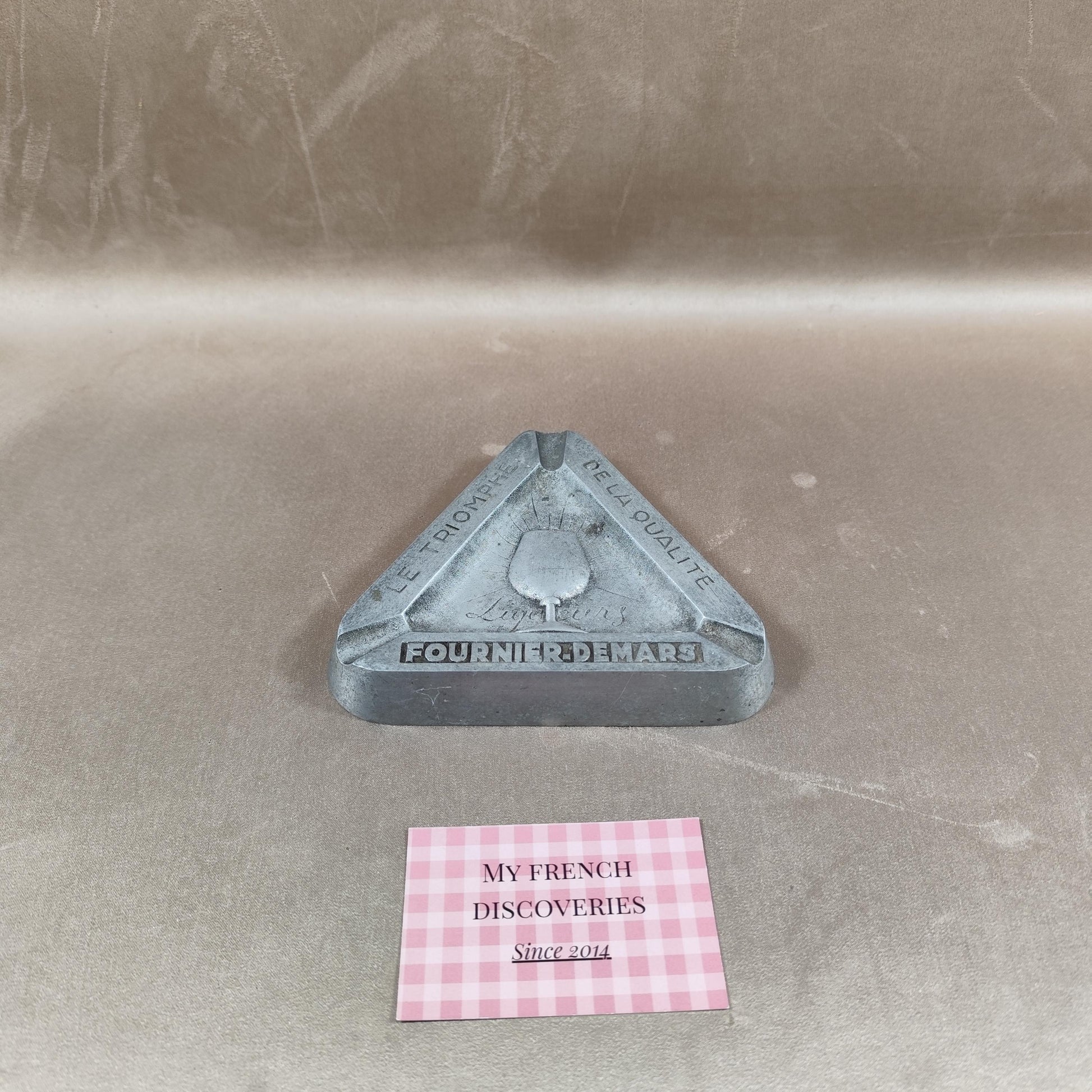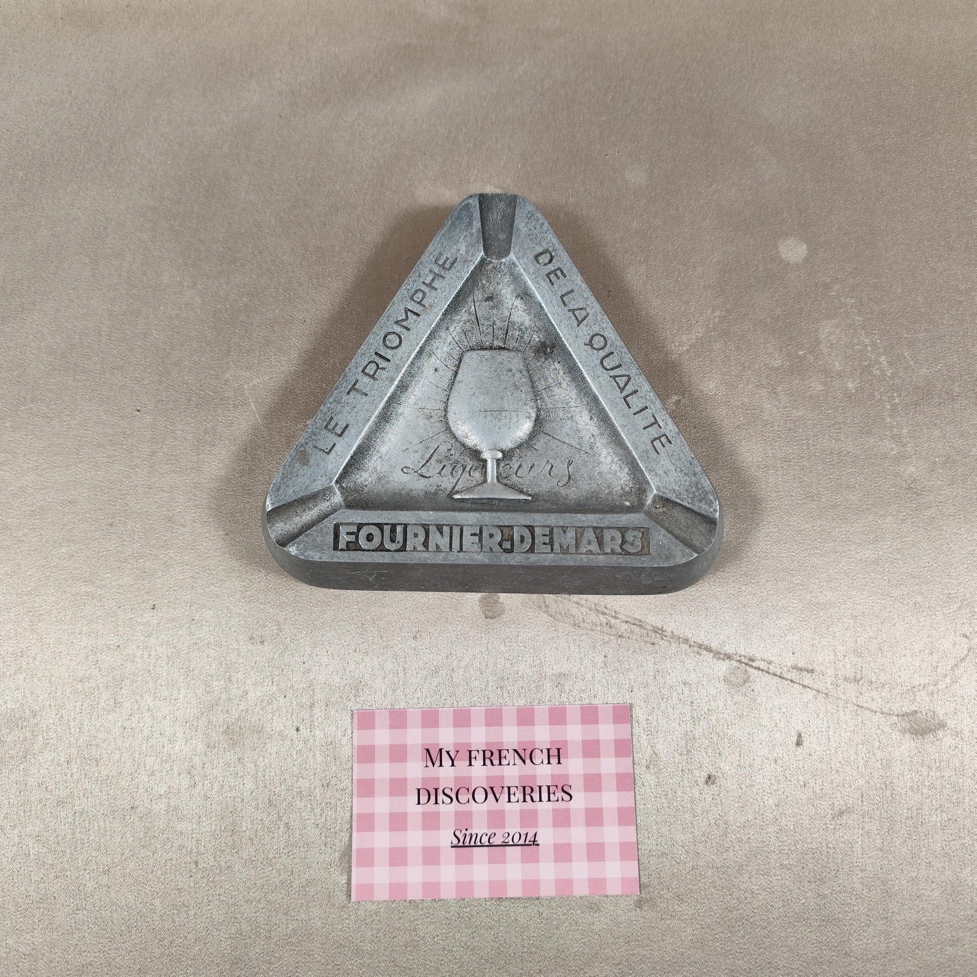 Cendrier publicitaire ancien en métal moulé, de forme triangulaire, réalisé pour la maison Fournier-Demars, producteur de liqueurs. Ce modèle porte les inscriptions « Le Triomphe de la Qualité » ainsi que le nom Fournier-Demars, accompagnées d’un décor central représentant un verre à pied et la mention « Liqueurs ». Objet publicitaire robuste et fonctionnel à l’origine, aujourd’hui recherché pour la décoration ou la collection liée à l’univers des spiritueux et de la publicité française.