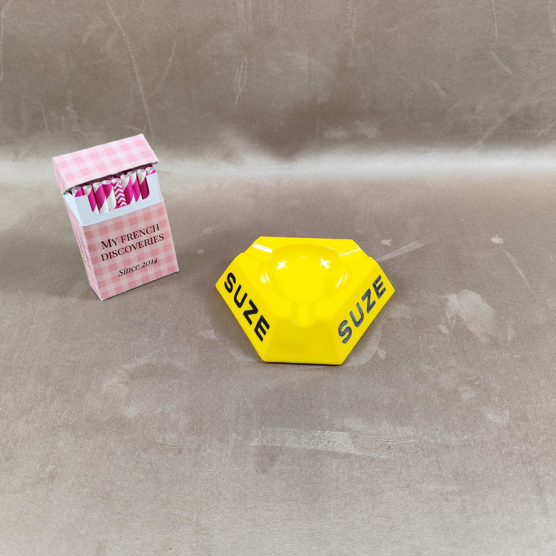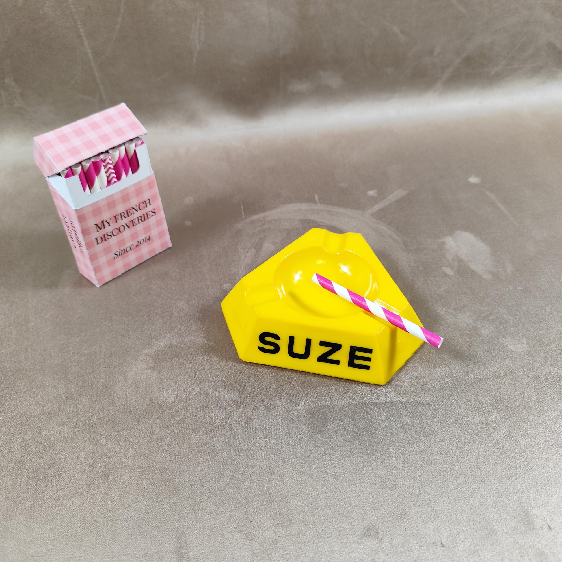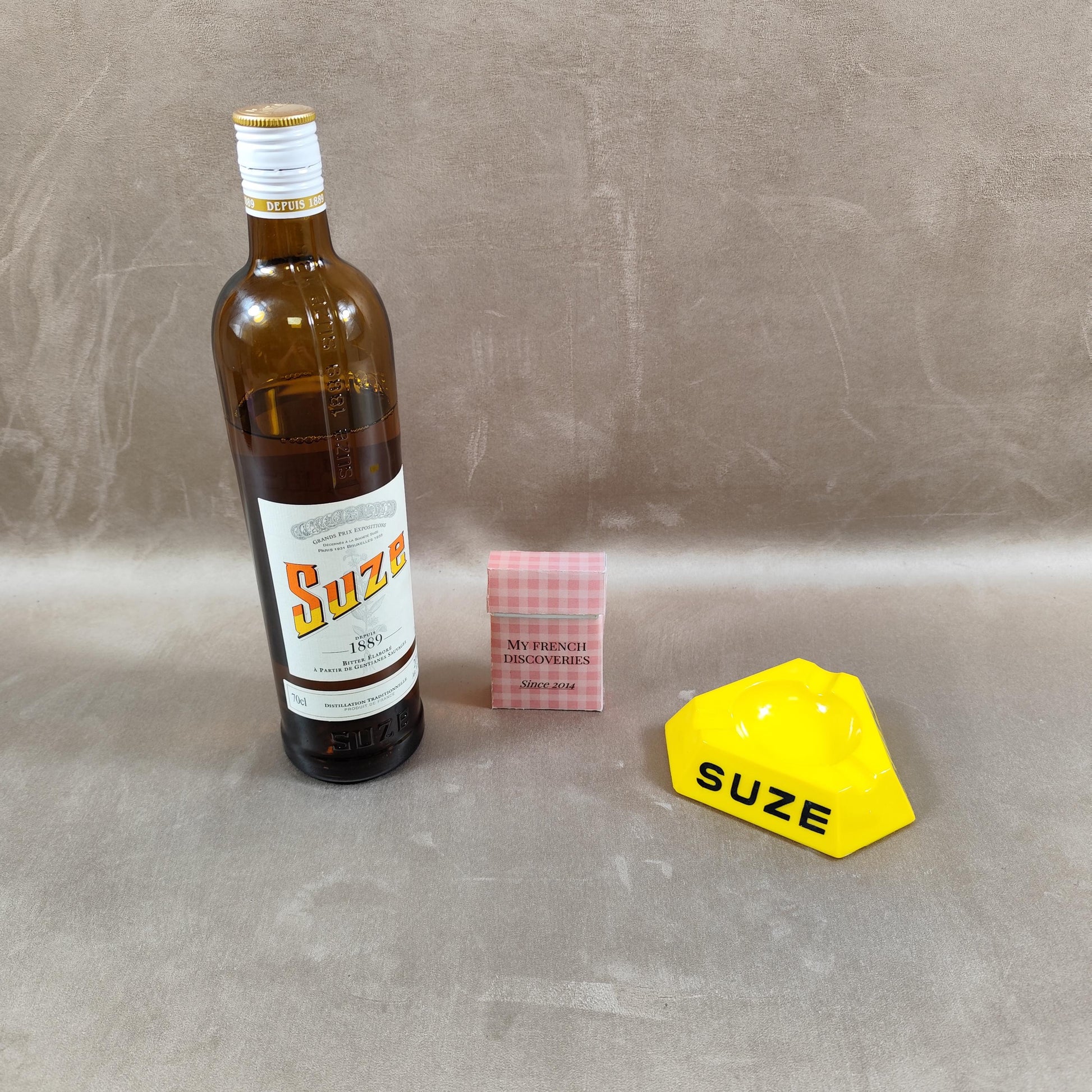 Cendrier publicitaire Suze en verre Opalex de couleur jaune vif, décoré du logo Suze en lettres noires. Modèle à forme géométrique avec cuvette centrale et encoches pour cigarettes. Objet emblématique de l’univers des cafés et bistrots français, également apprécié en décoration ou collection d’objets publicitaires liés aux marques d’apéritifs.
