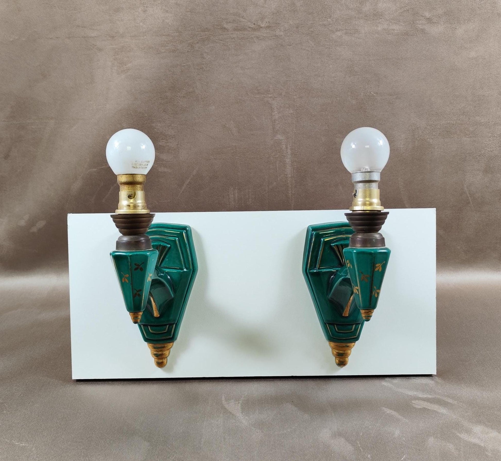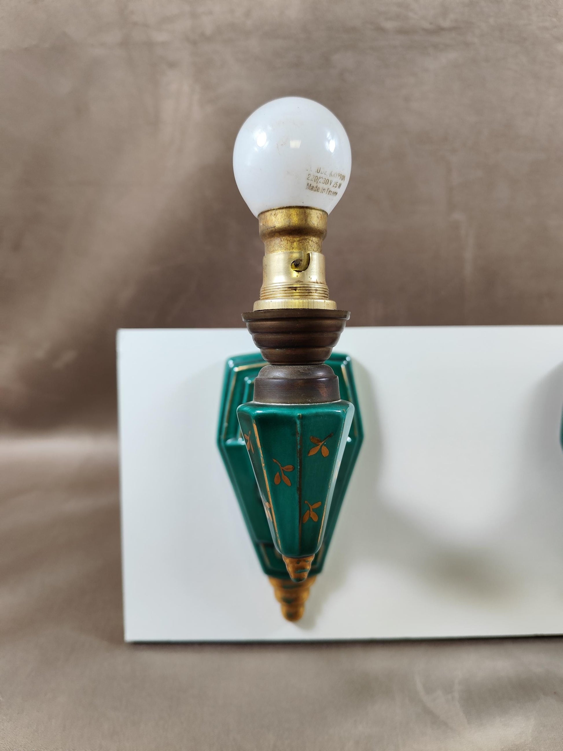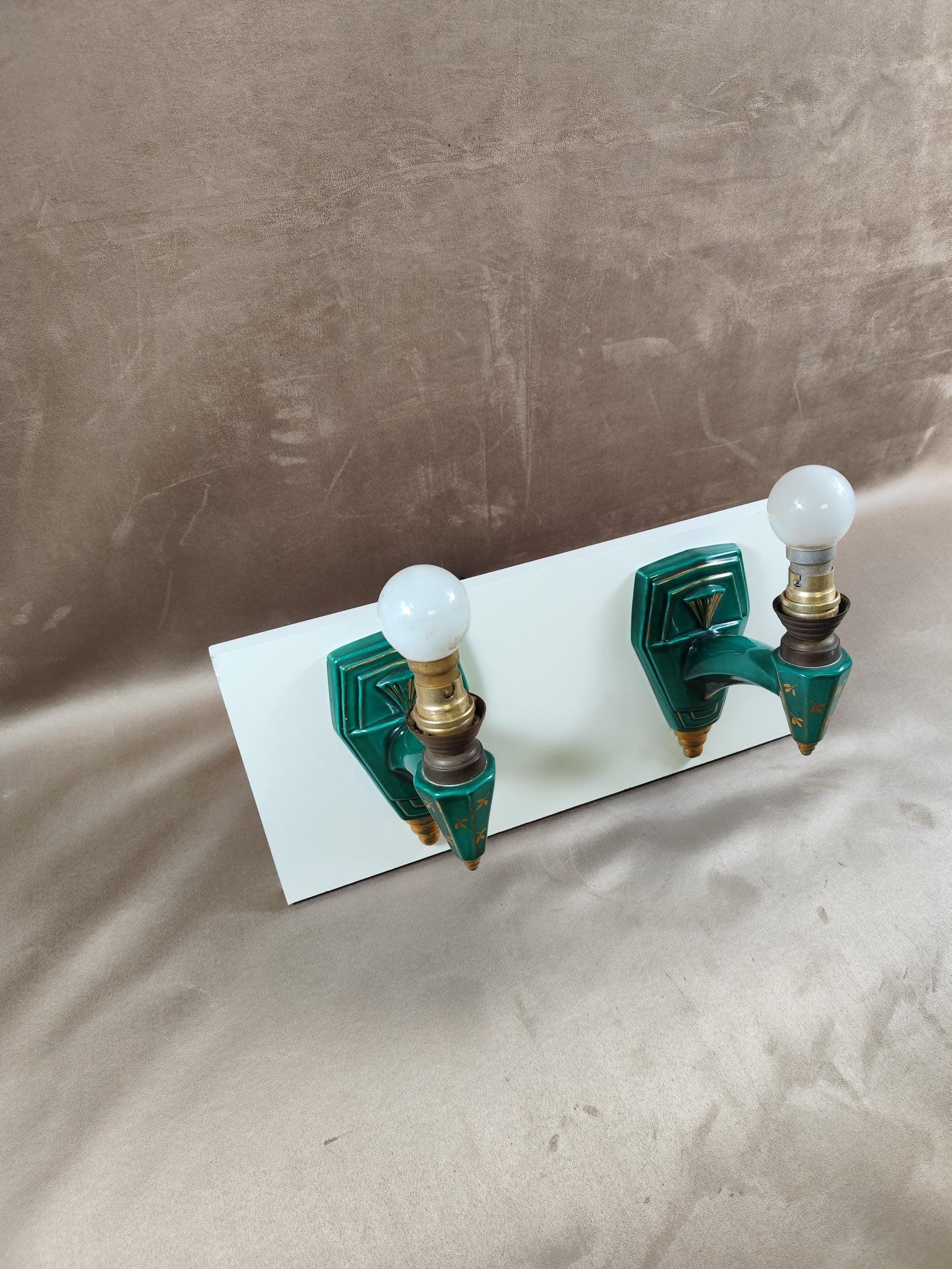 Lot de 2 appliques murales Art déco en céramique émaillée verte et dorée Made in France Vintage 1940