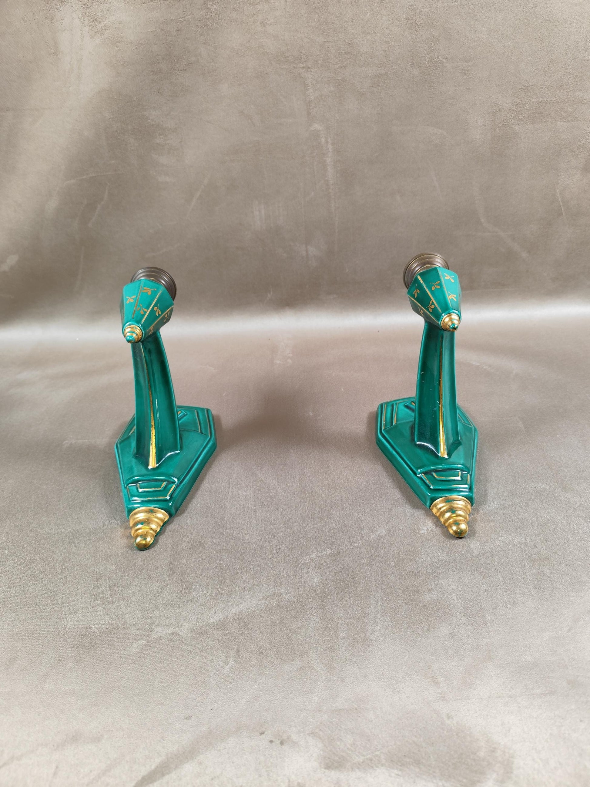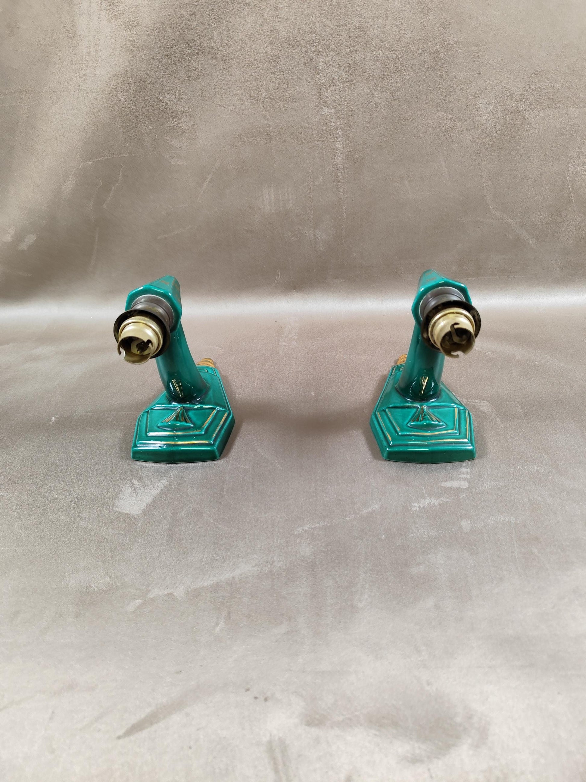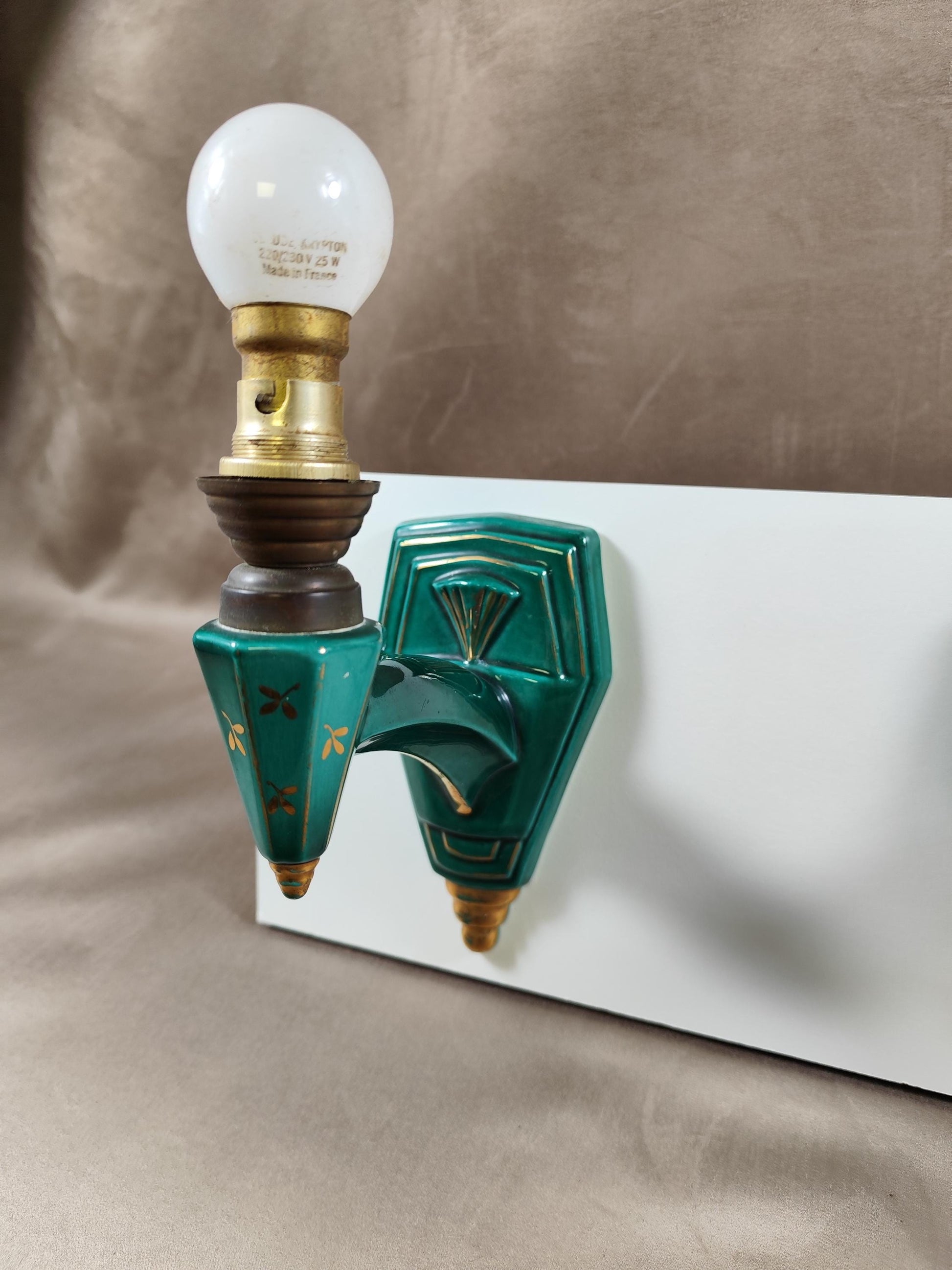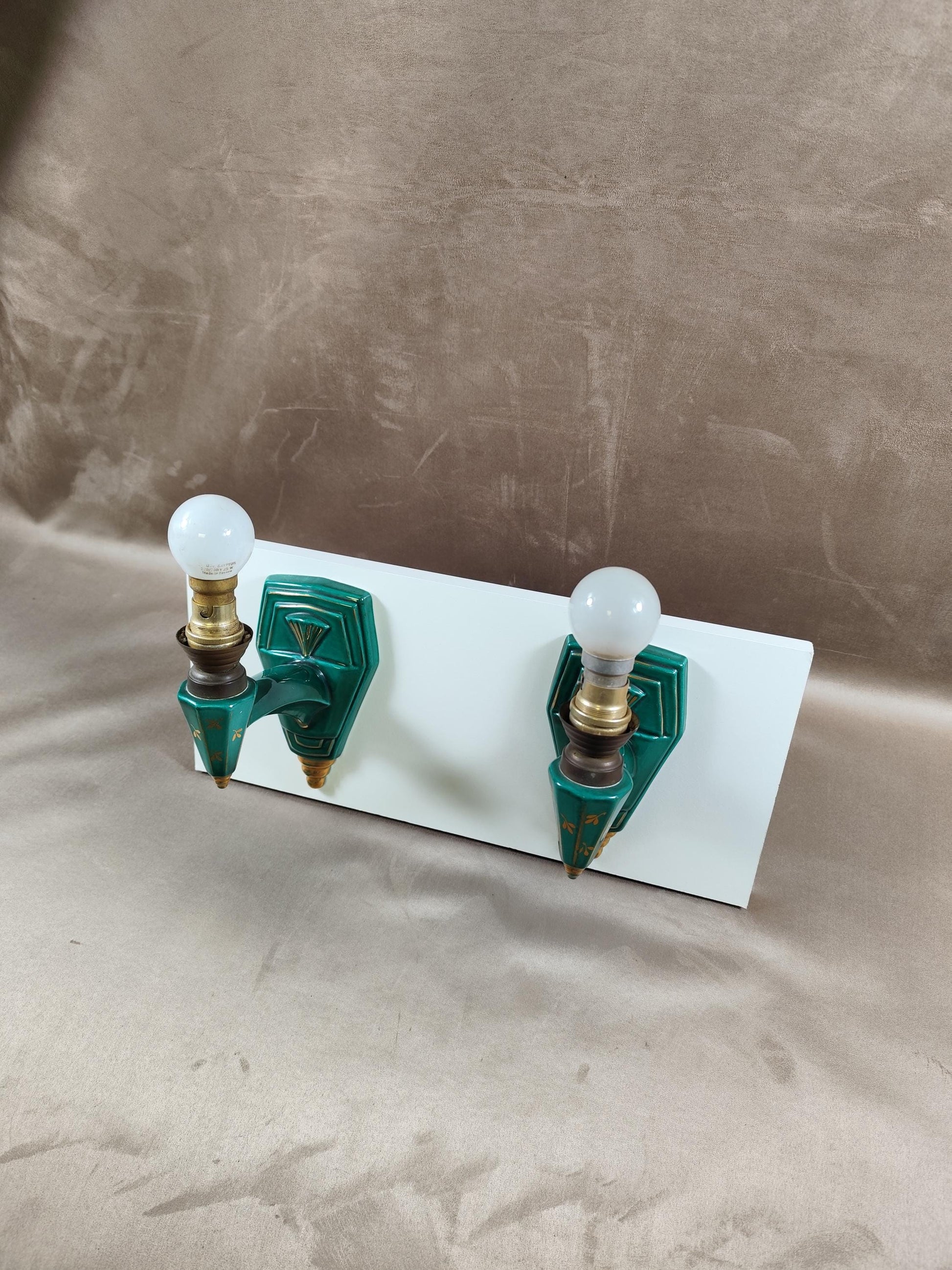 Lot de 2 appliques murales Art déco en céramique émaillée verte et dorée Made in France Vintage 1940