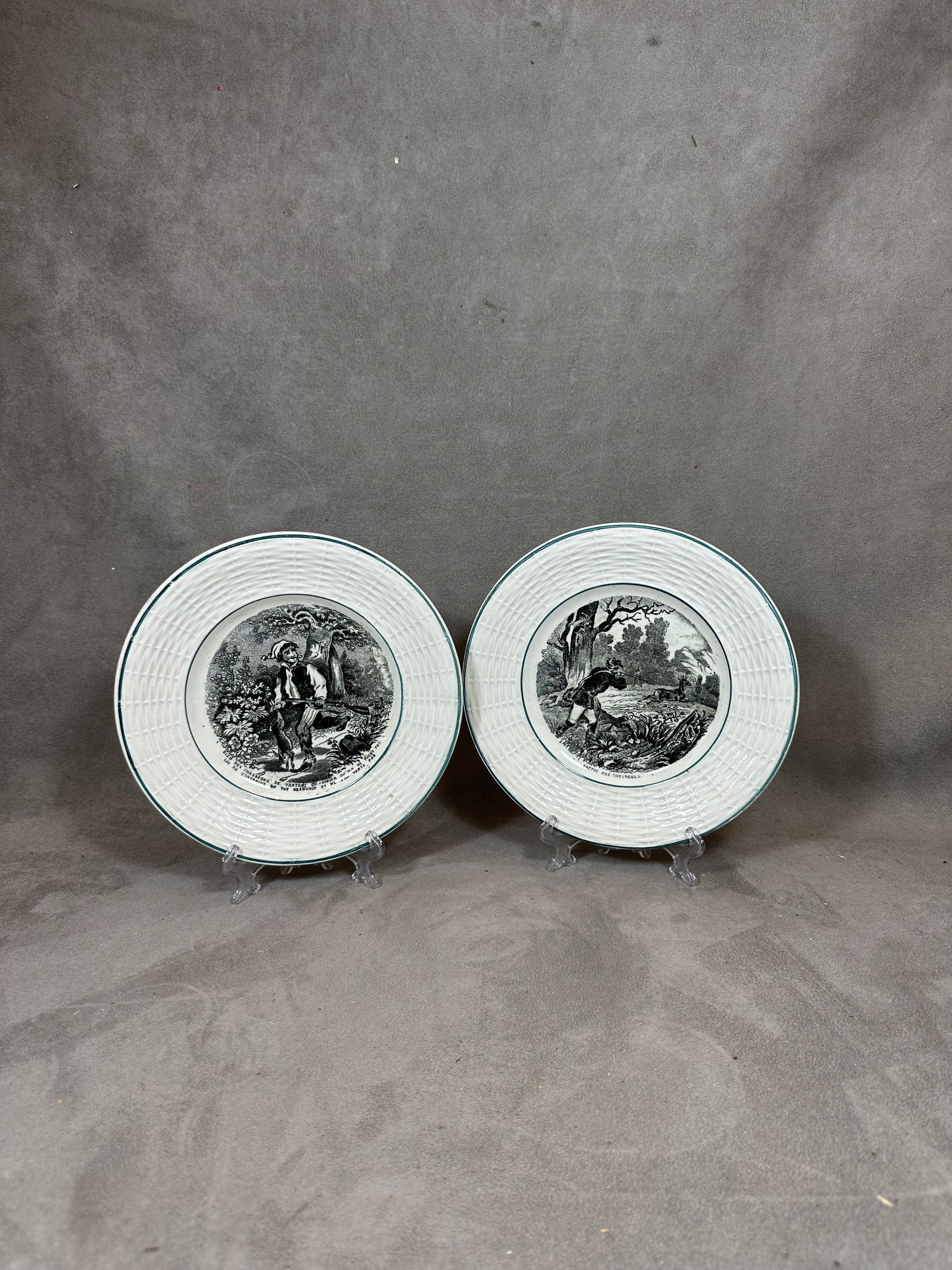 Set of 2 old talking plates on the theme of hunting DIGOIN Sarreguemines in vintage earthenware Made in France 1900
