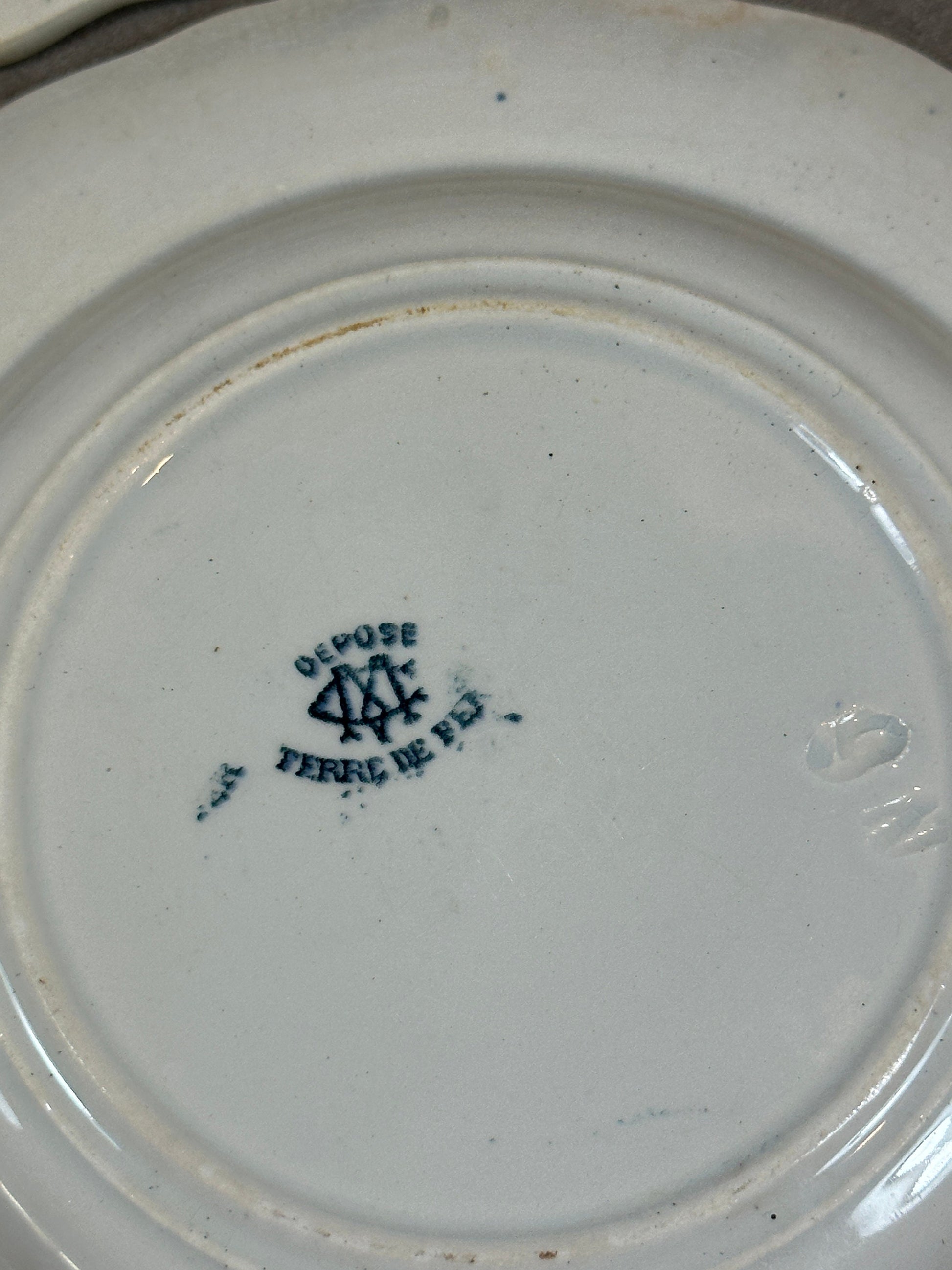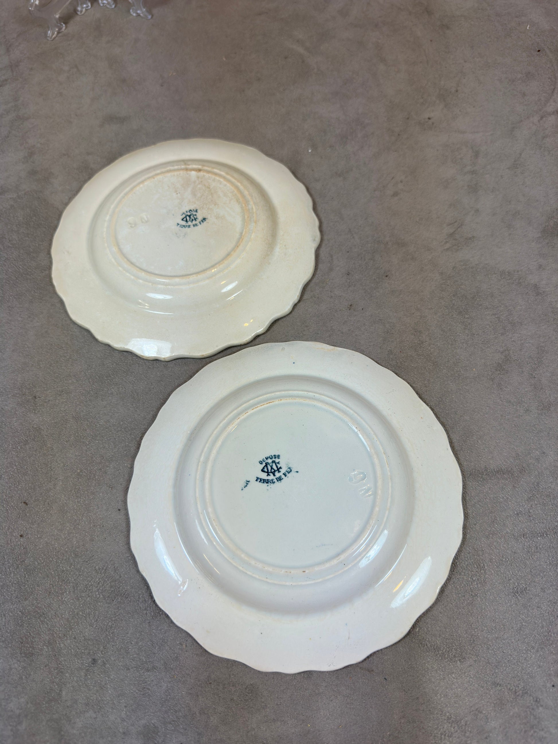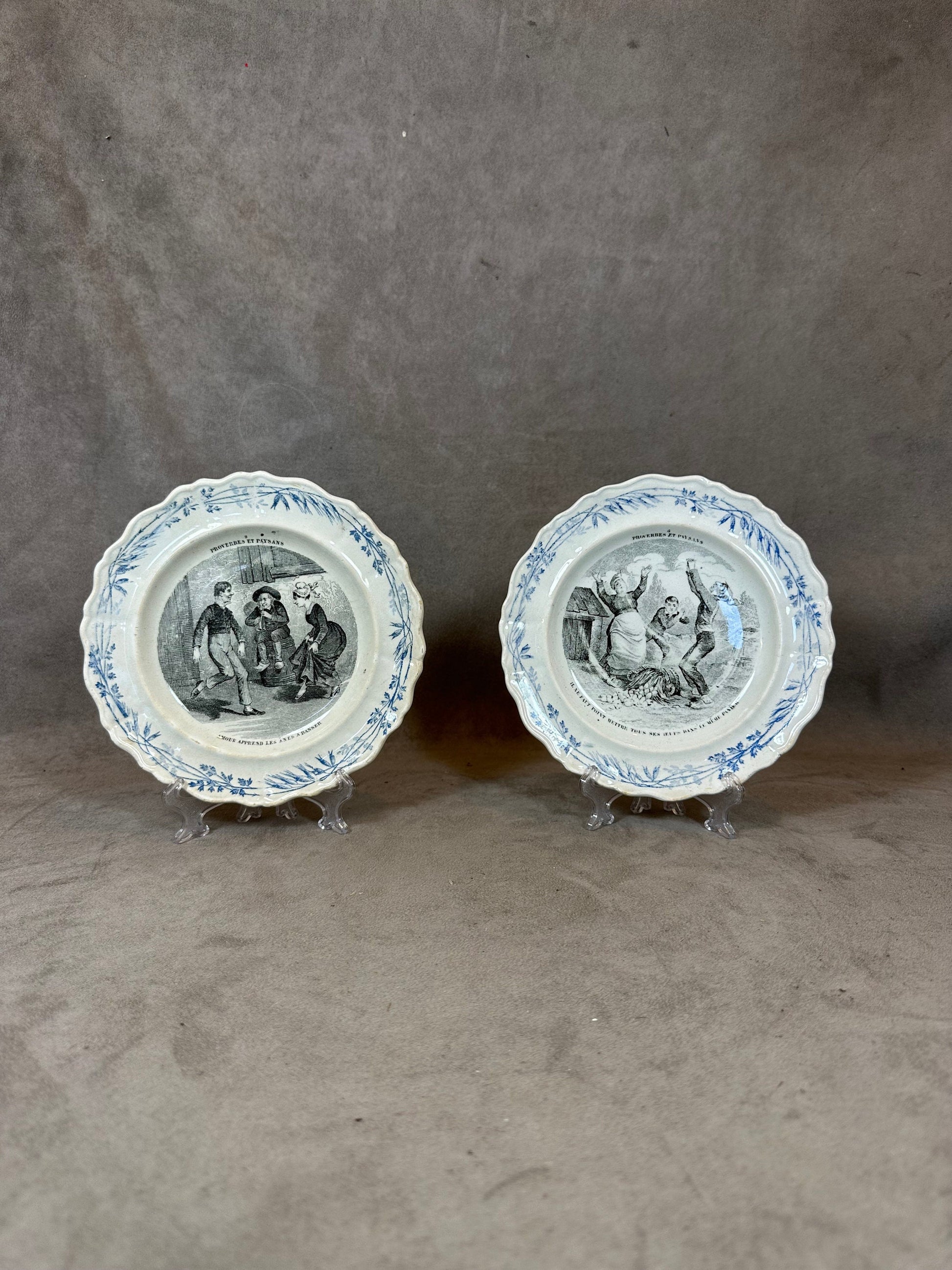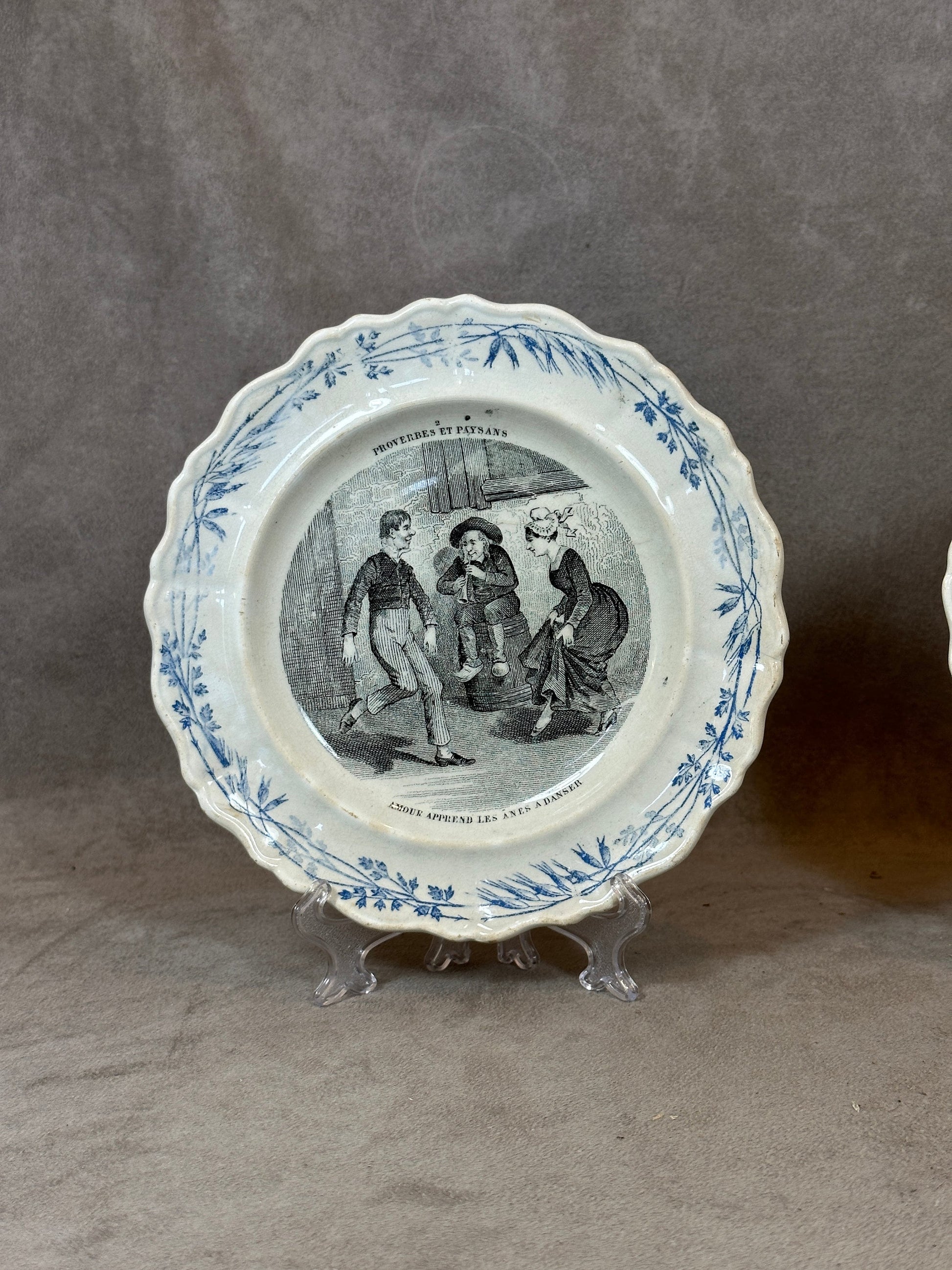 Set of 2 old talking plates in earthenware on the theme of peasant proverbs Creil and Montereau Terre de Fer made in France 1900