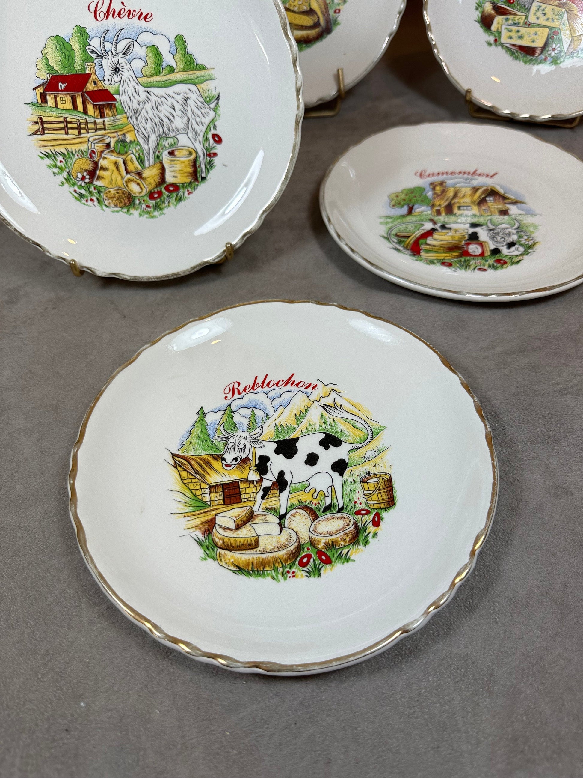 Set of 6 Earthenware Plates on the Theme of Cheese by Moulin des Loups, Made in France, Vintage 1960