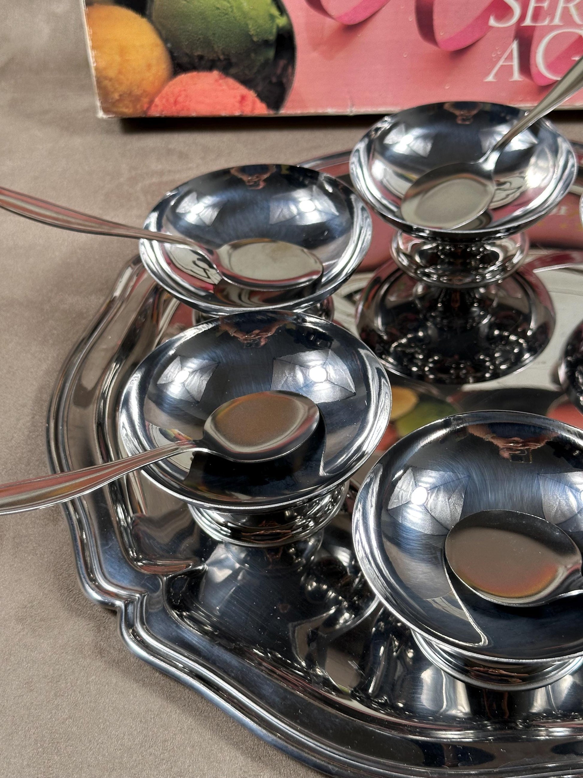 Set of 6 ice cream cups with 6 spoons and tray in 18/10 stainless steel vintage Made in France
