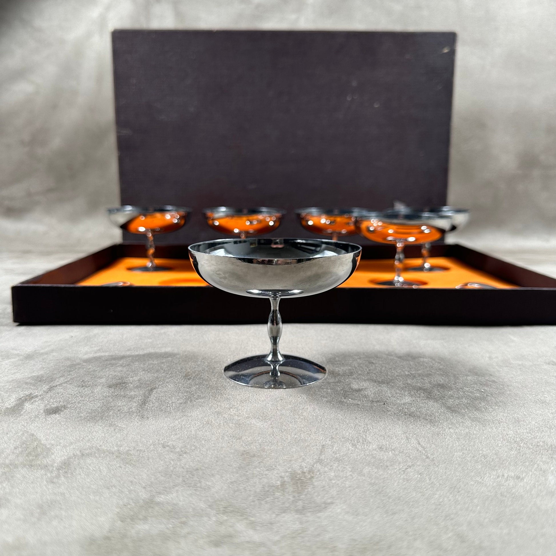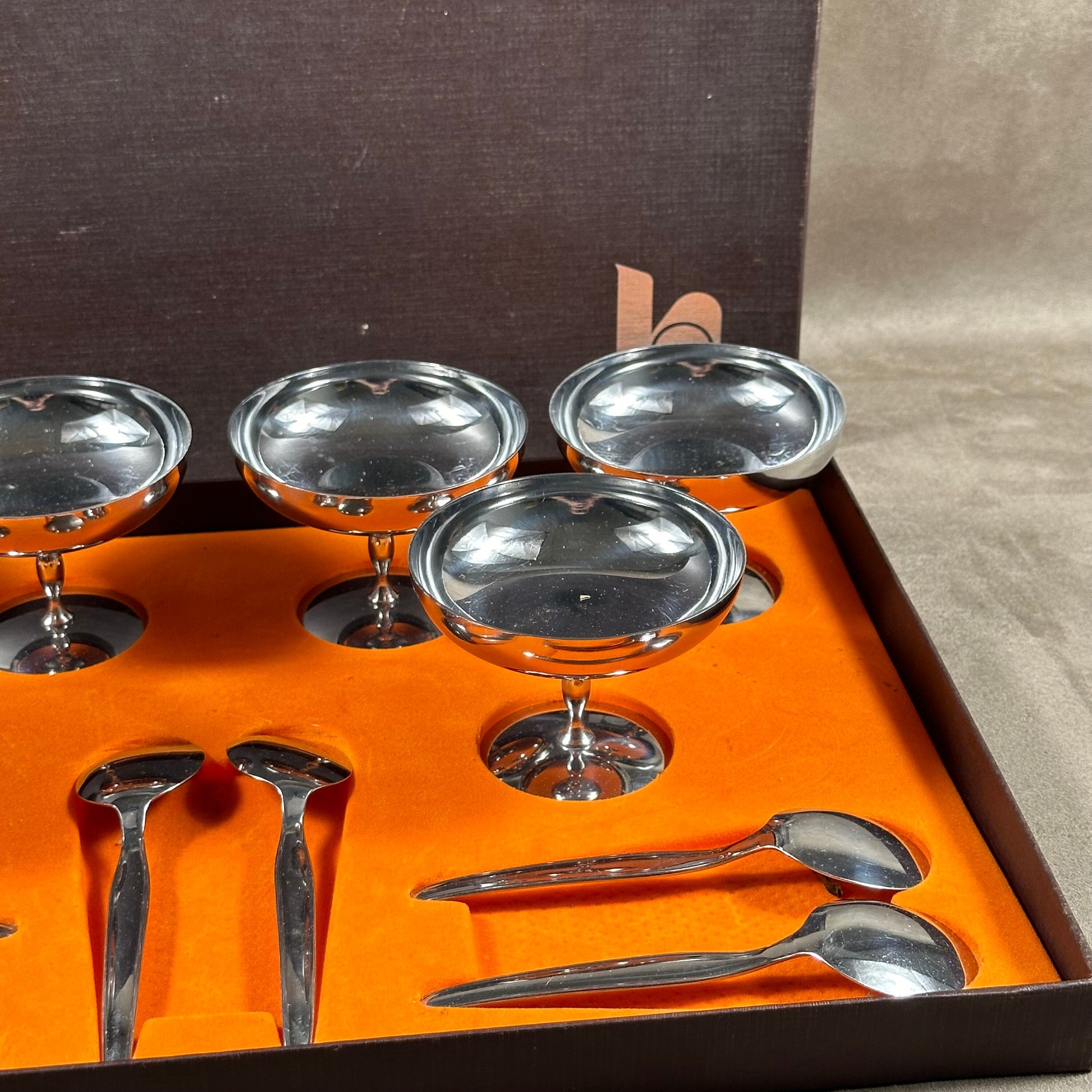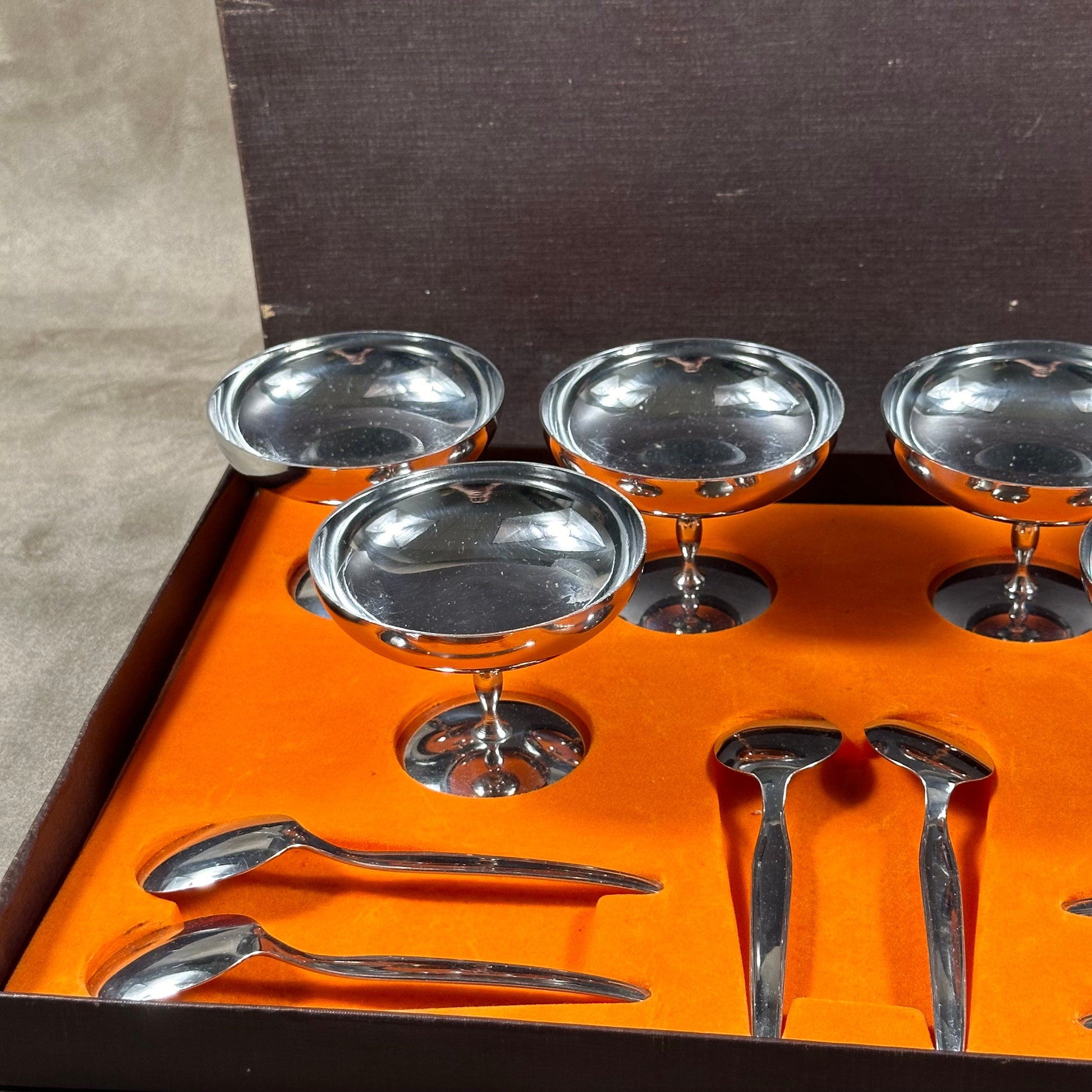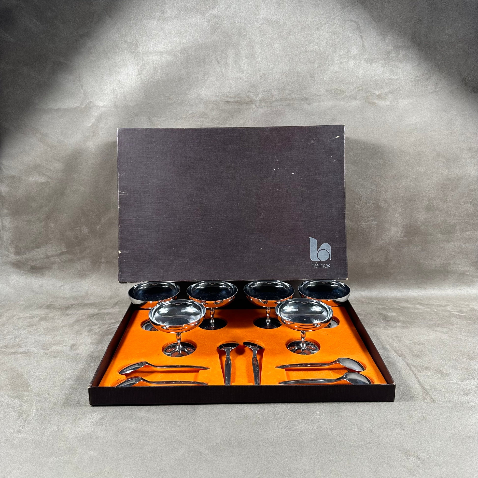 Set of 6 ice cream cups with 6 Helinox spoons in 18/10 vintage stainless steel Made in France