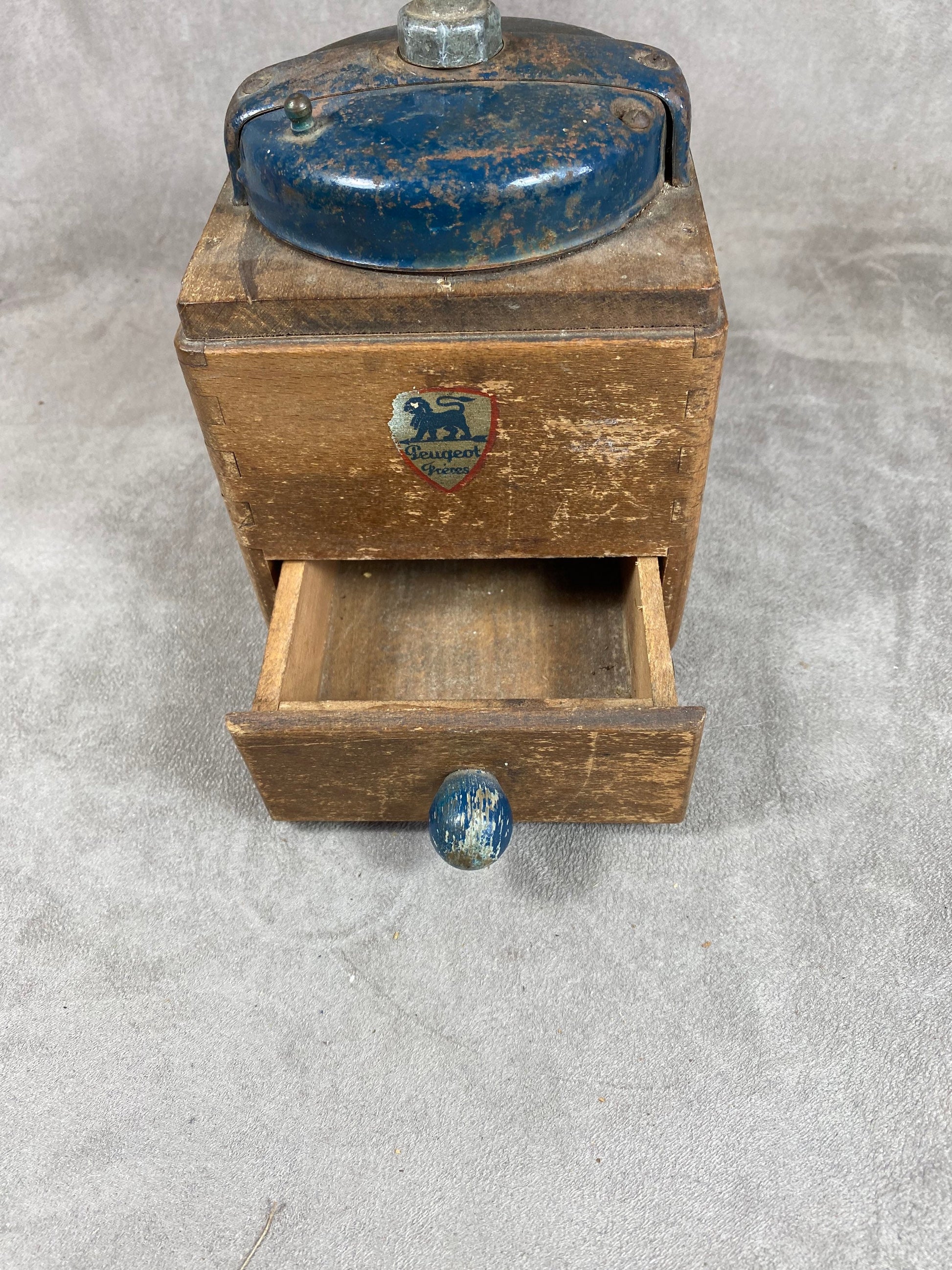 Peugeot Frères blue sheet metal and wood coffee grinder EX model dated between 1947 and 1960 Shabby chic Made in France