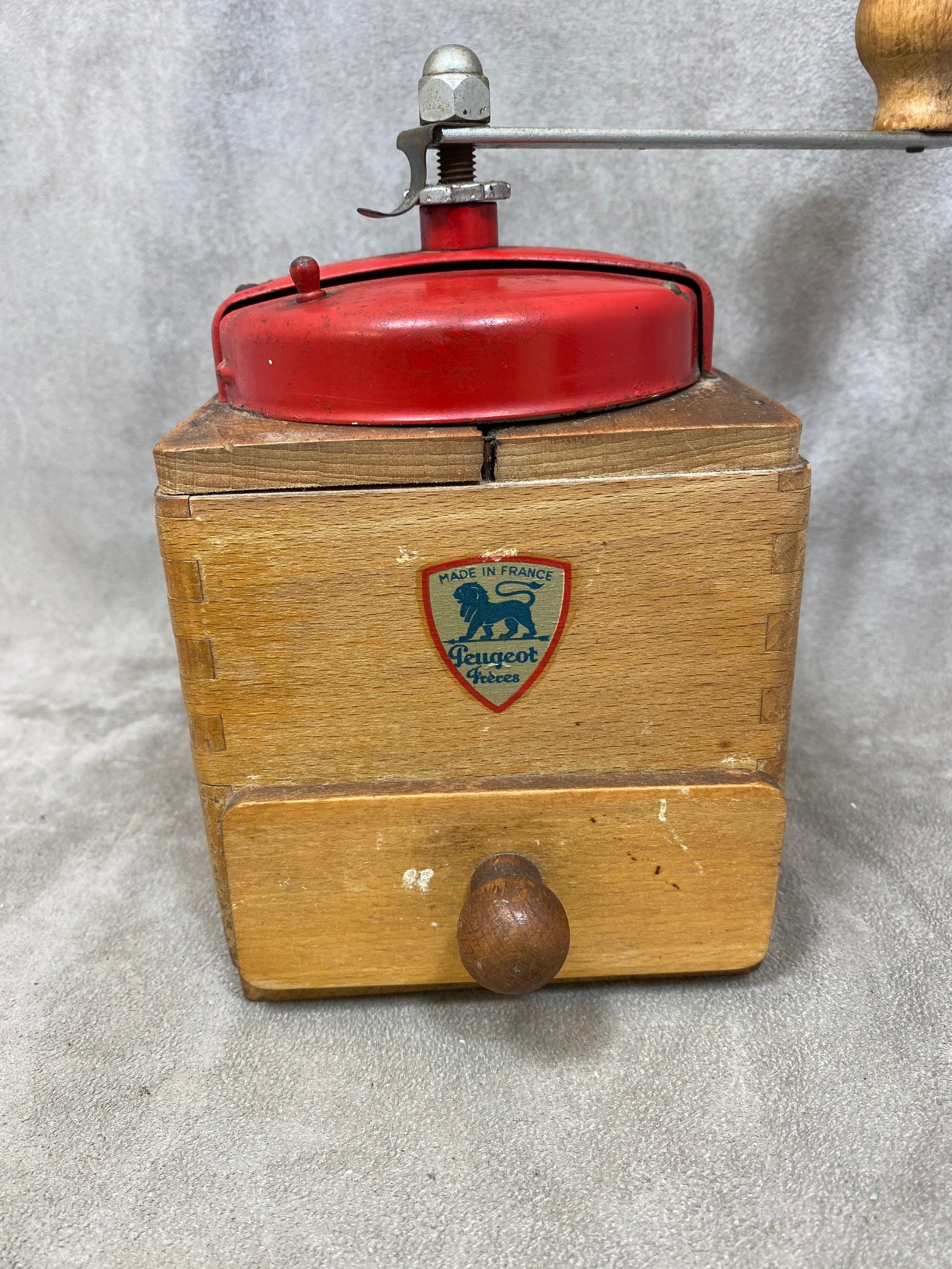Peugeot Frères red sheet metal and wood coffee grinder EX model dated between 1947 and 1960 Shabby chic Made in France