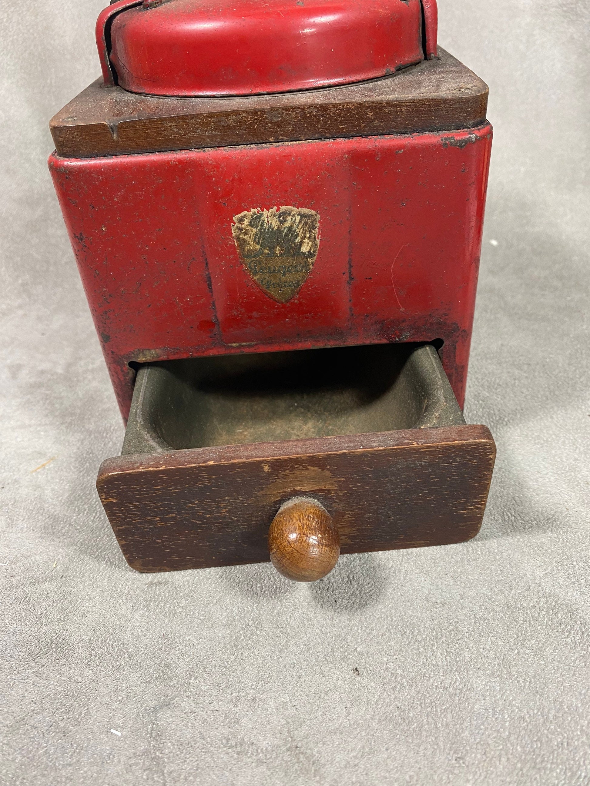 Peugeot Frères red sheet metal and wood coffee grinder EX model dated between 1947 and 1960 Shabby chic Made in France