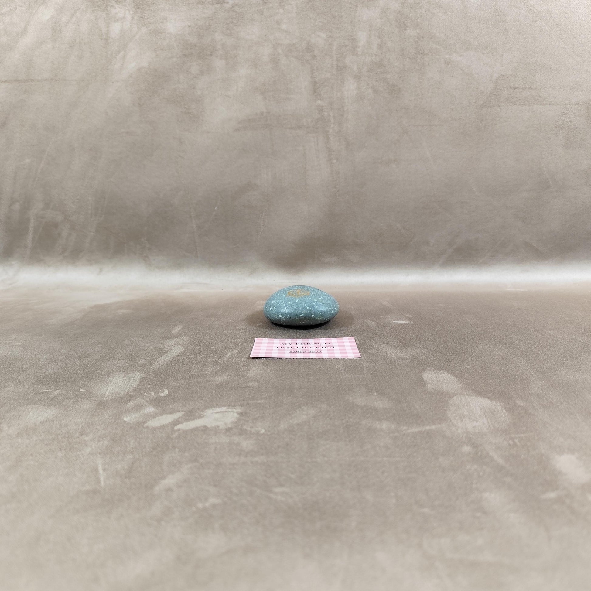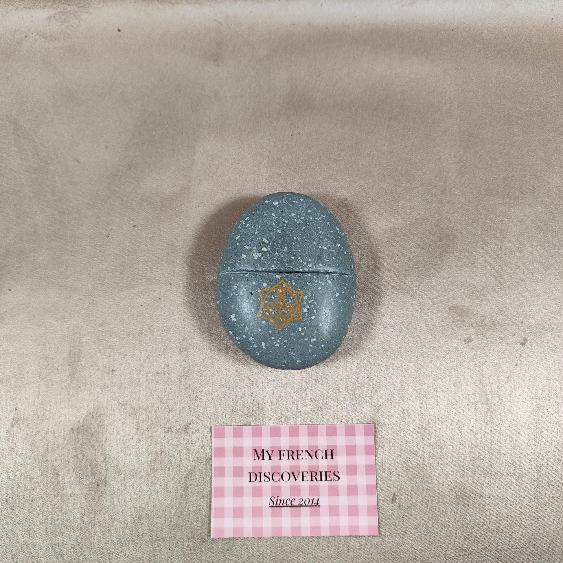 Presse-papiers publicitaire Veuve Clicquot réalisé en pierre polie de teinte bleu-gris, à l’aspect moucheté, orné du monogramme VCP doré. Modèle de forme galet avec rainure centrale permettant également l’utilisation comme porte-cartes ou support de présentation. Objet massif et stable, issu de l’univers promotionnel des grandes maisons de champagne.