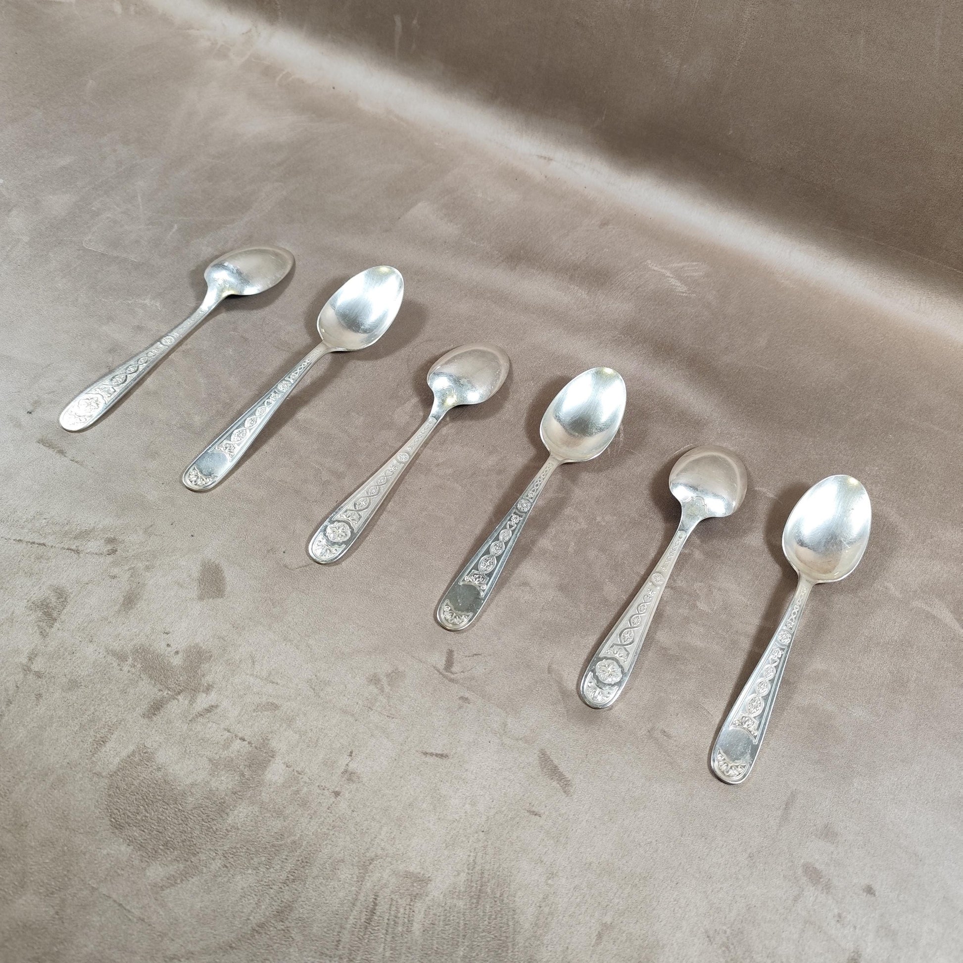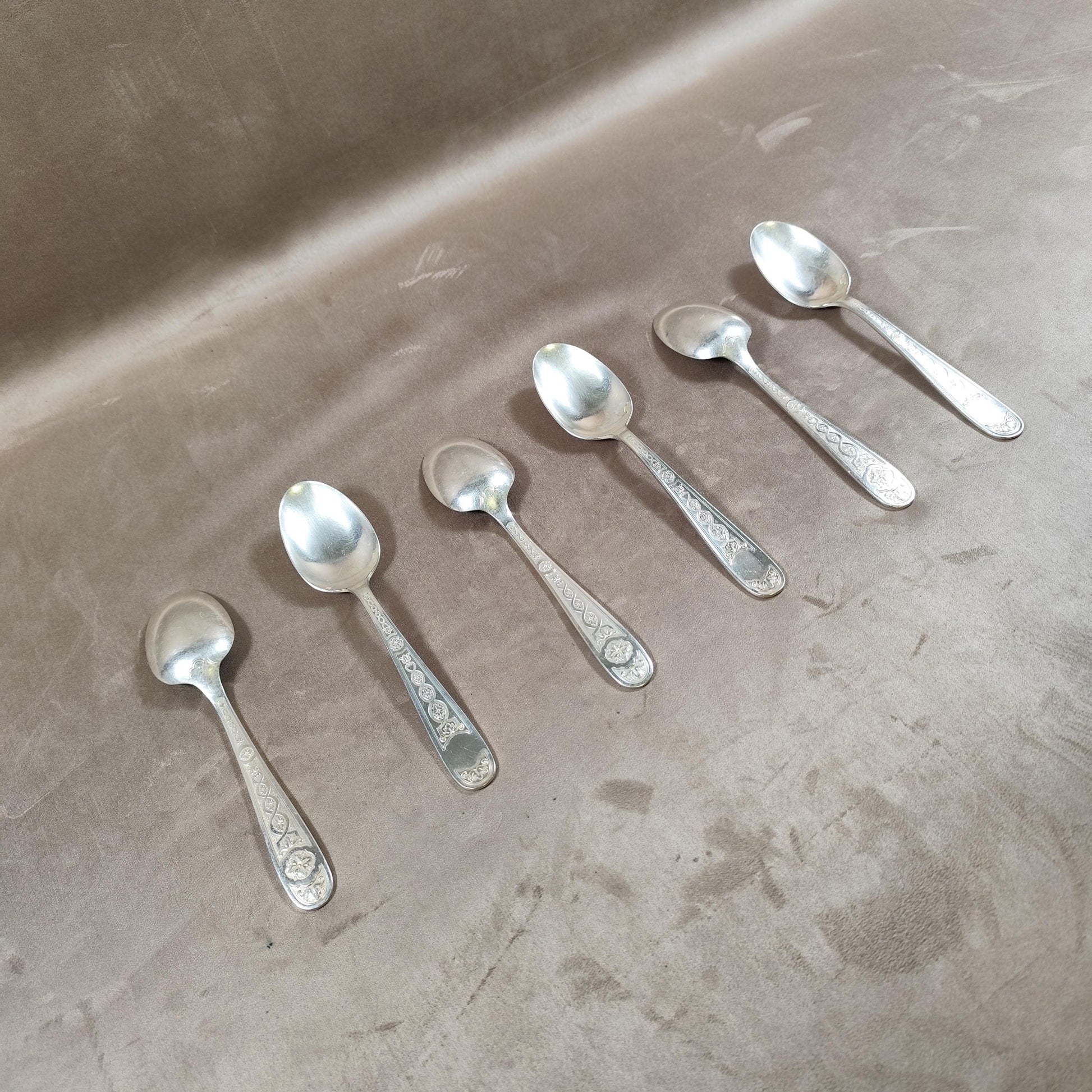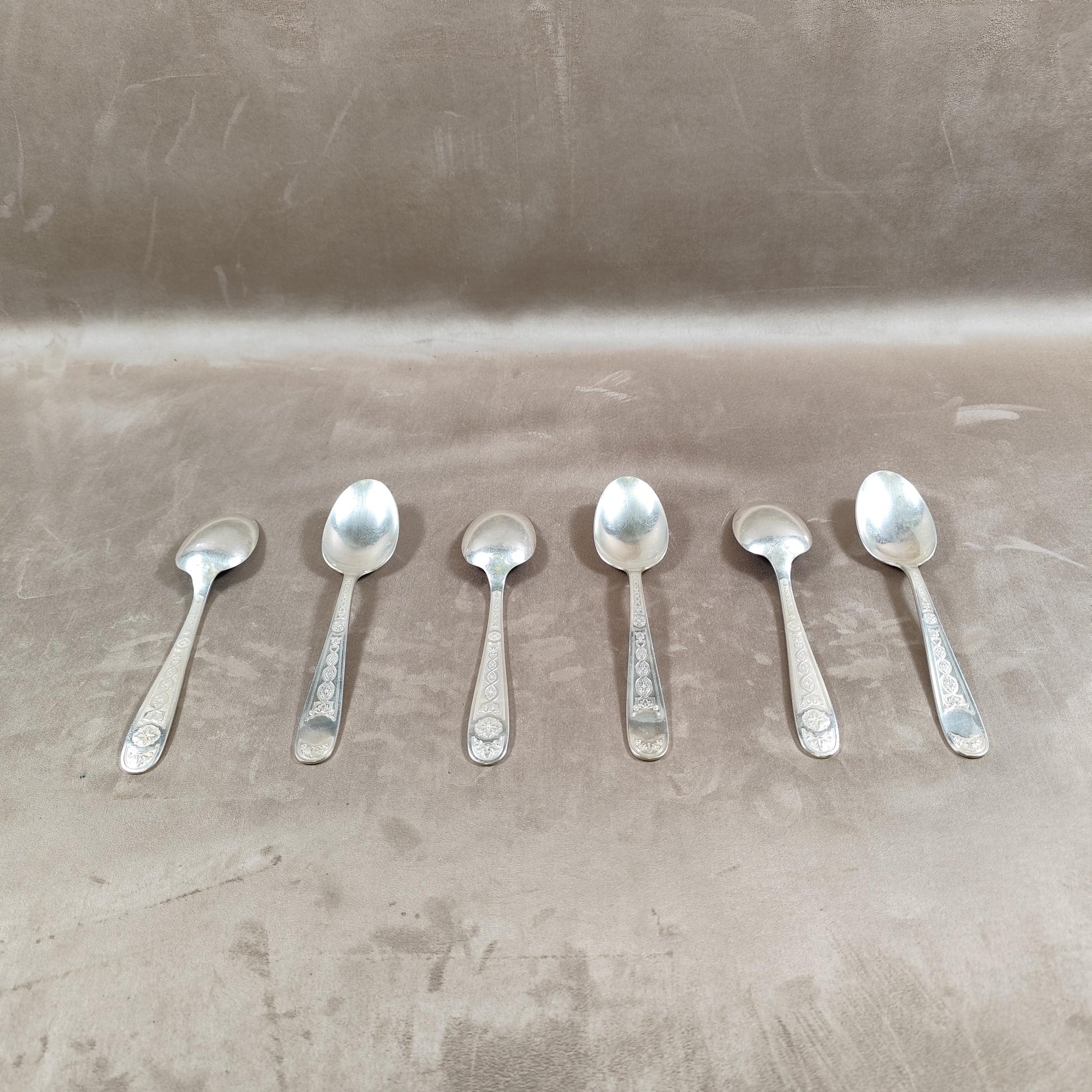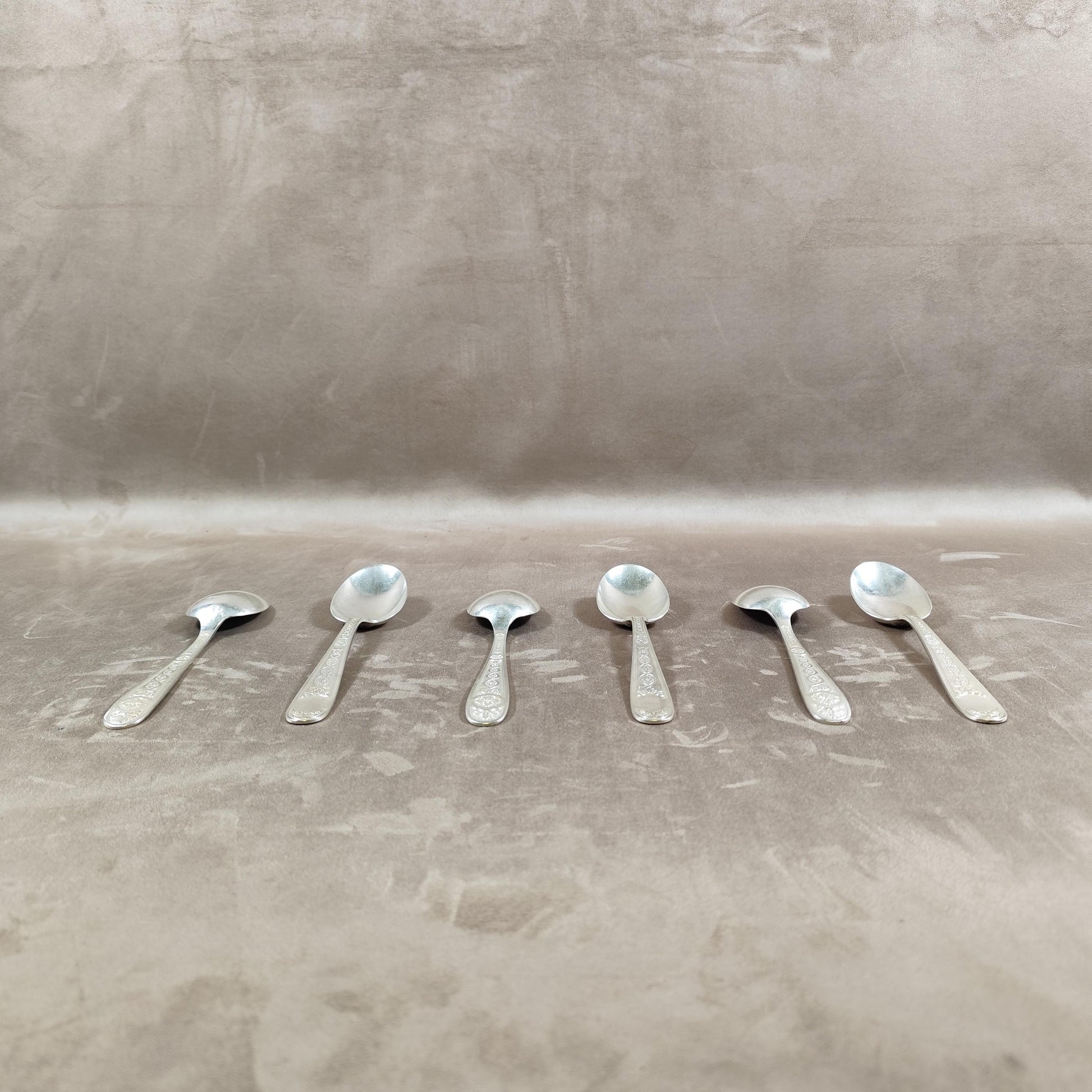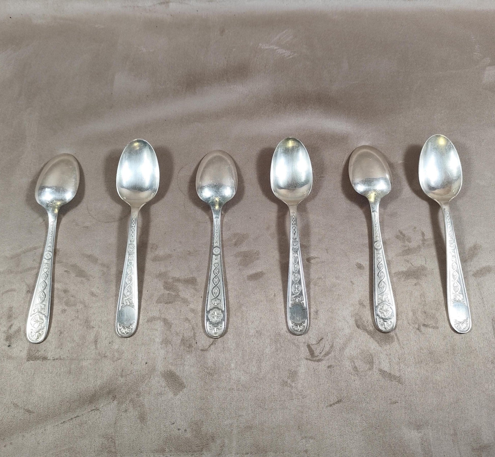 Lot de 6 cuillères anciennes en métal argenté, décor fin sur les manches. Un ensemble élégant, idéal pour compléter un service ancien ou pour une utilisation quotidienne raffinée.