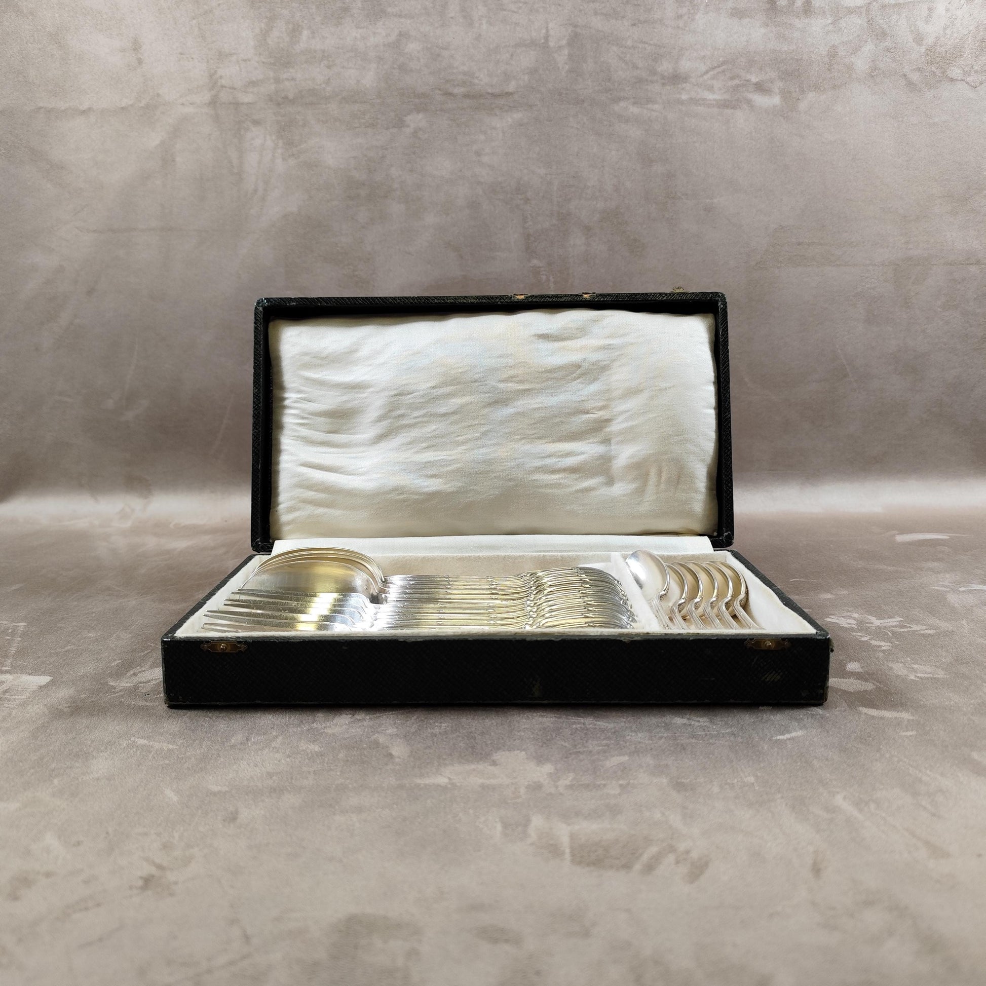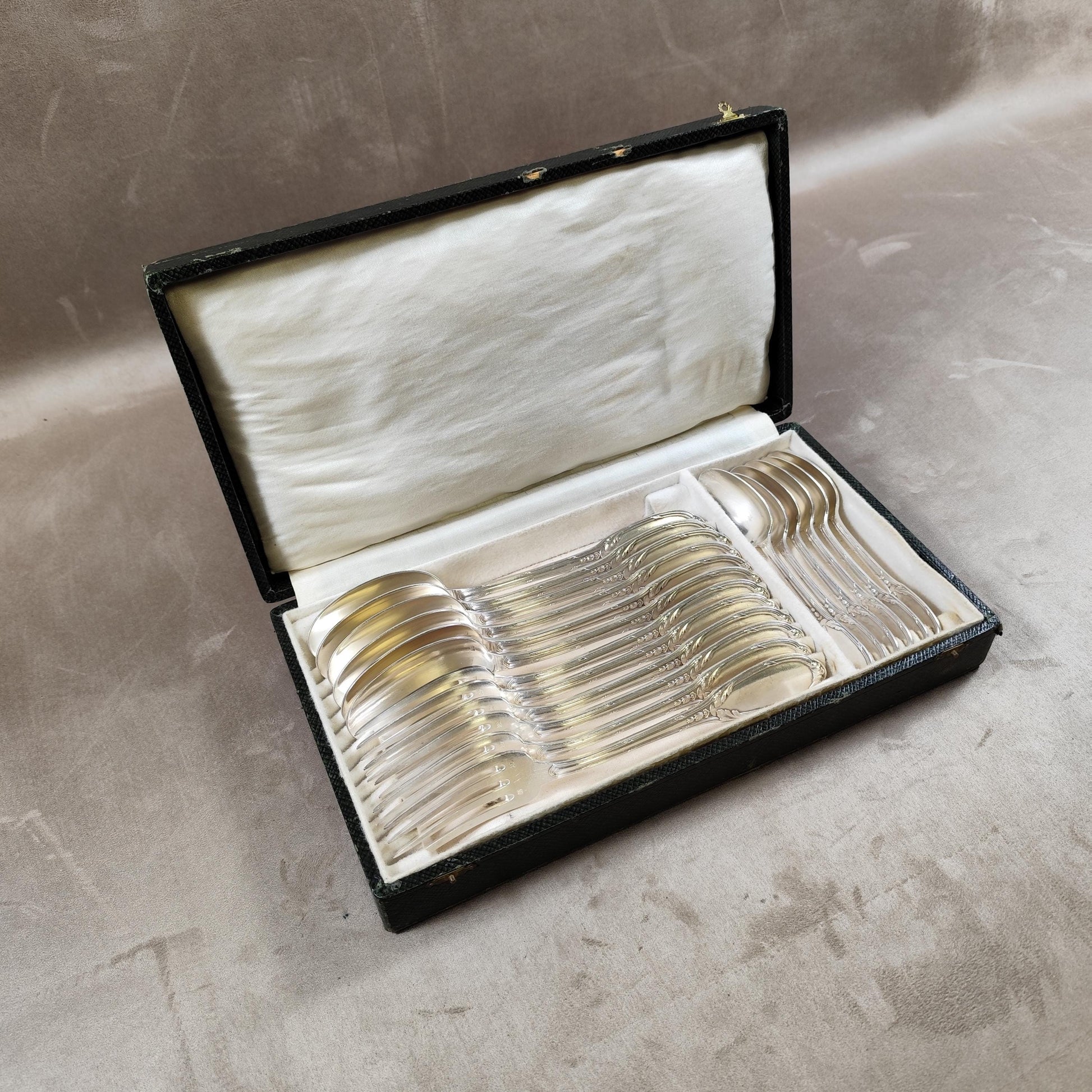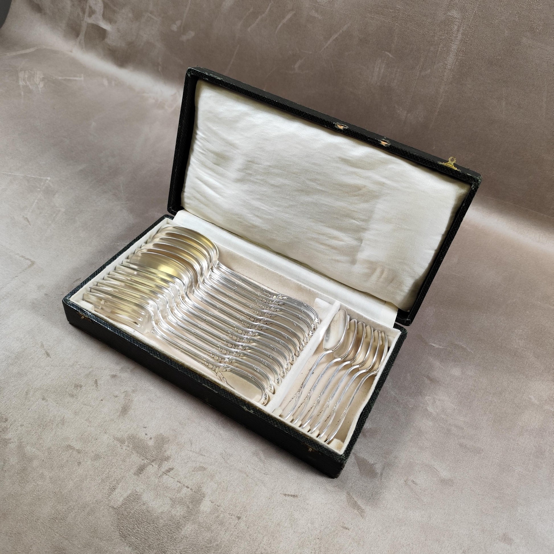 RARE Ménagère ancienne 18 pièces pour 6 personnes – fourchettes & cuillères en métal argenté dans son écrin 1900