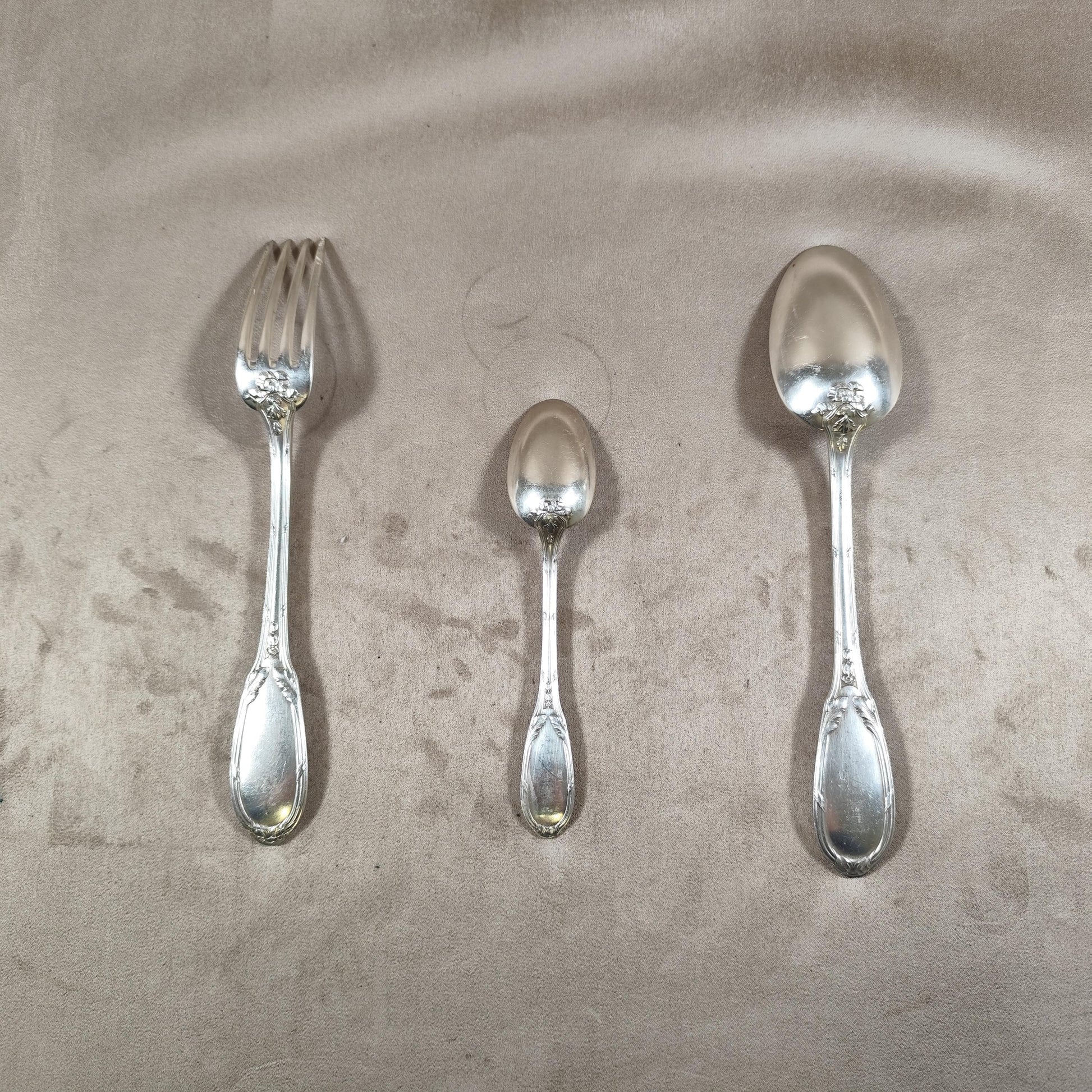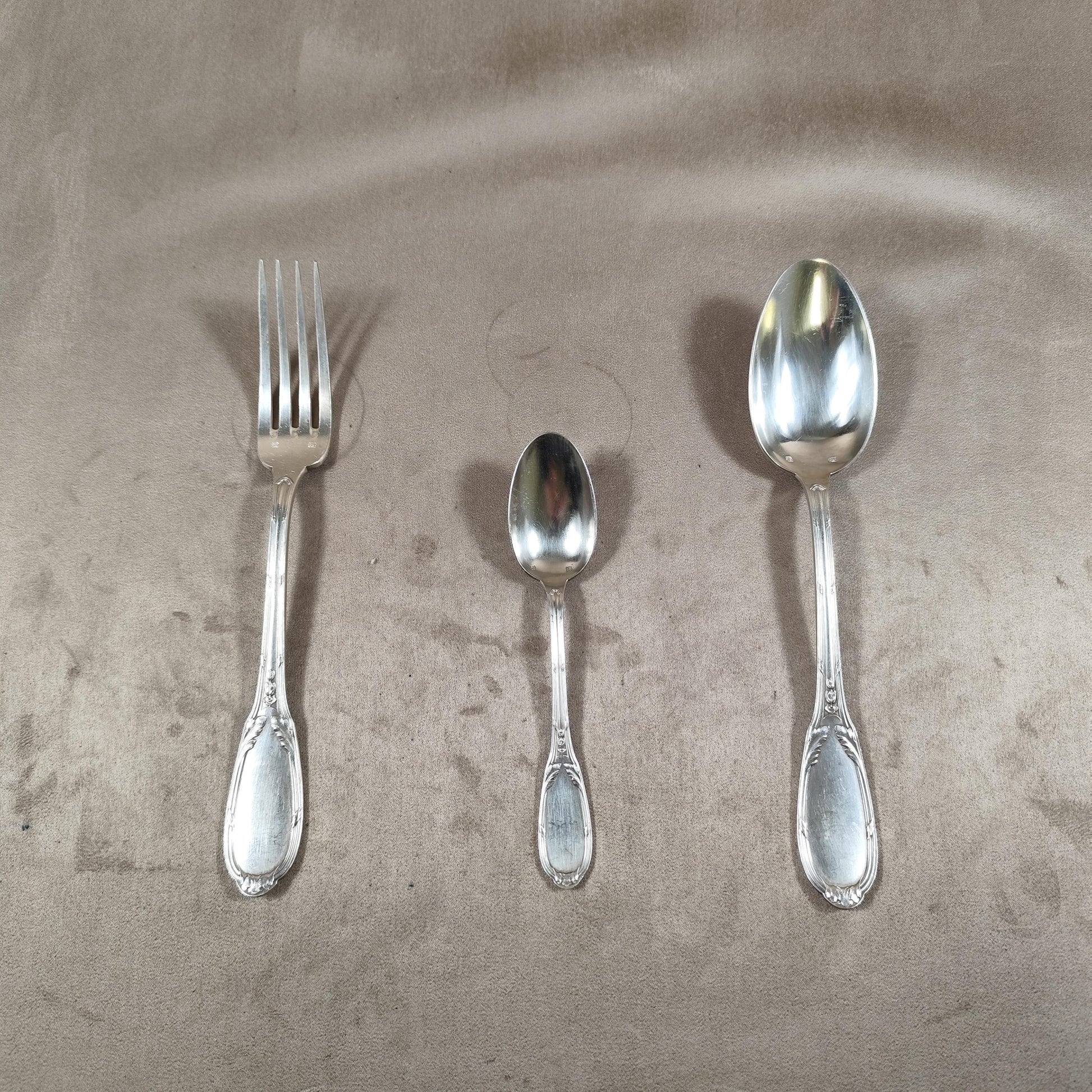 Ensemble en bon état général, avec marques d’usage, micro-rayures et traces du temps conformes à une ménagère ancienne. L’écrin présente également des signes d’âge. Les pièces restent toutefois très belles et parfaitement utilisables.