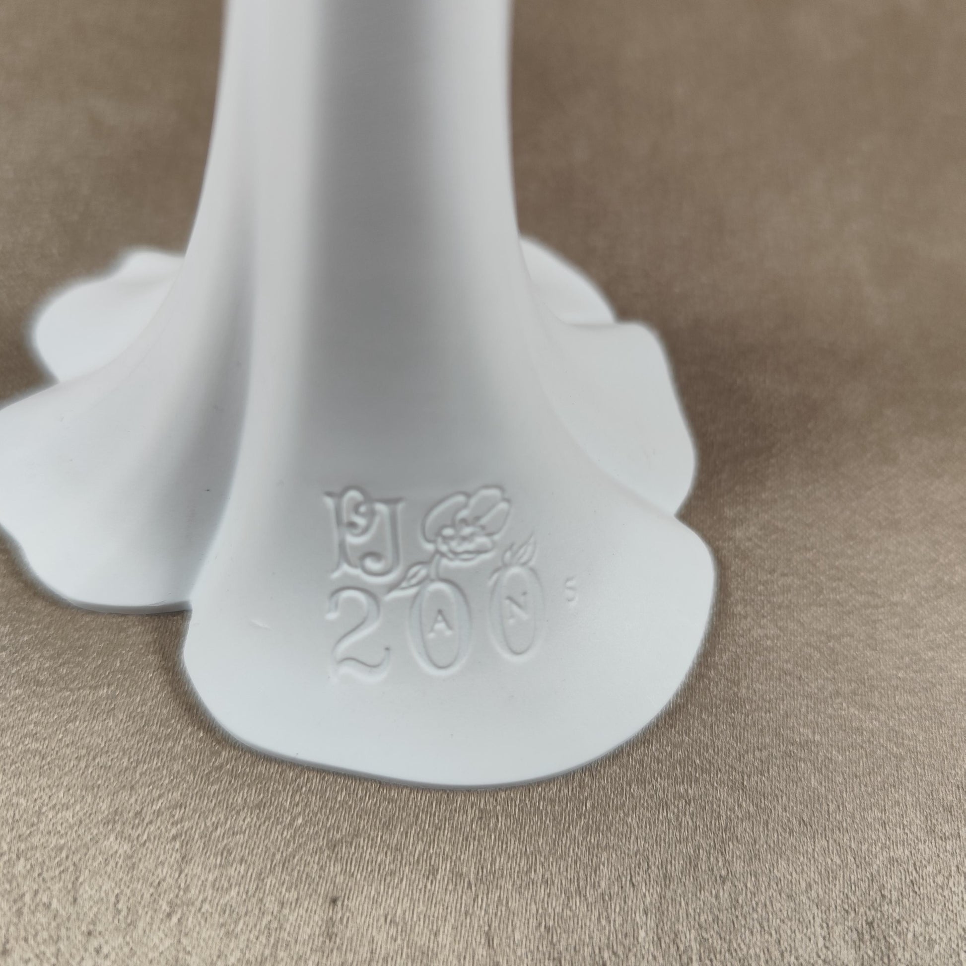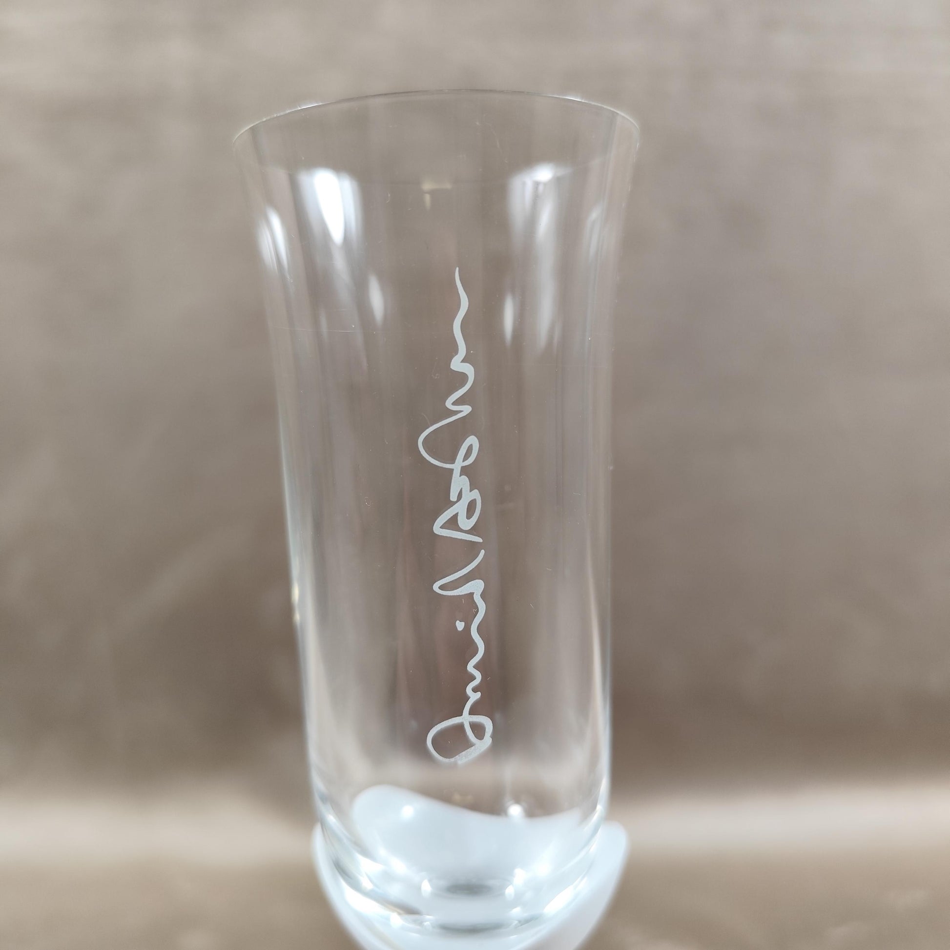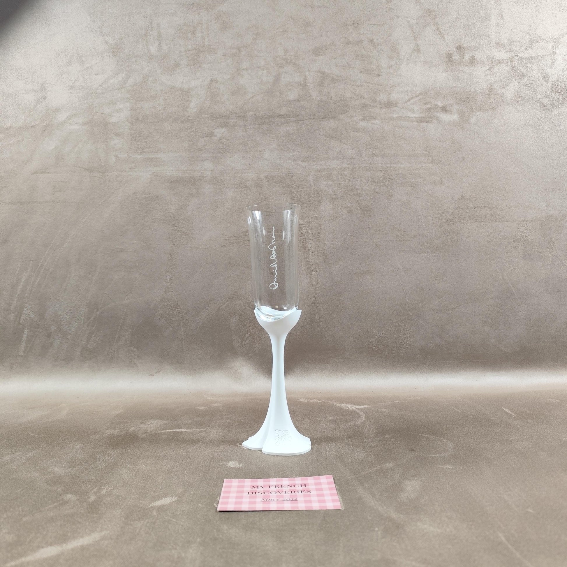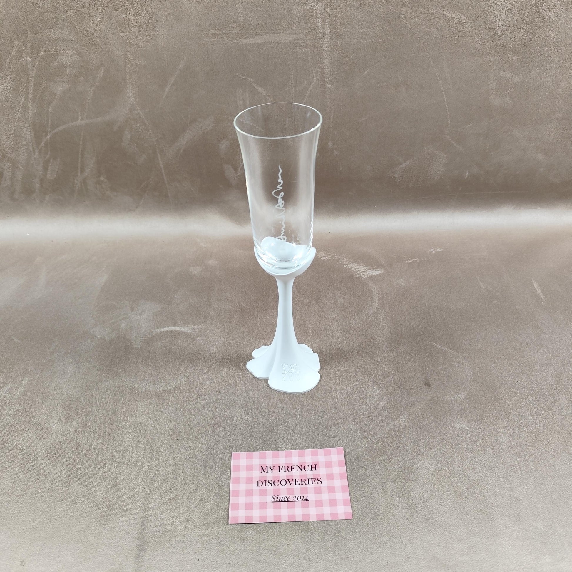 Flûte à champagne en verre éditée par la maison Perrier-Jouët à l’occasion des 200 ans de la marque. Modèle élégant associant un calice en verre transparent à un pied blanc mat en forme de fleur d’anémone, emblème iconique de la cuvée Belle Époque. Signature « Perrier-Jouët » présente sur le verre et marquage « PJ 200 ans » moulé sur la base. Pièce promotionnelle devenue aujourd’hui recherchée pour la collection ou pour une table de champagne distinctive.